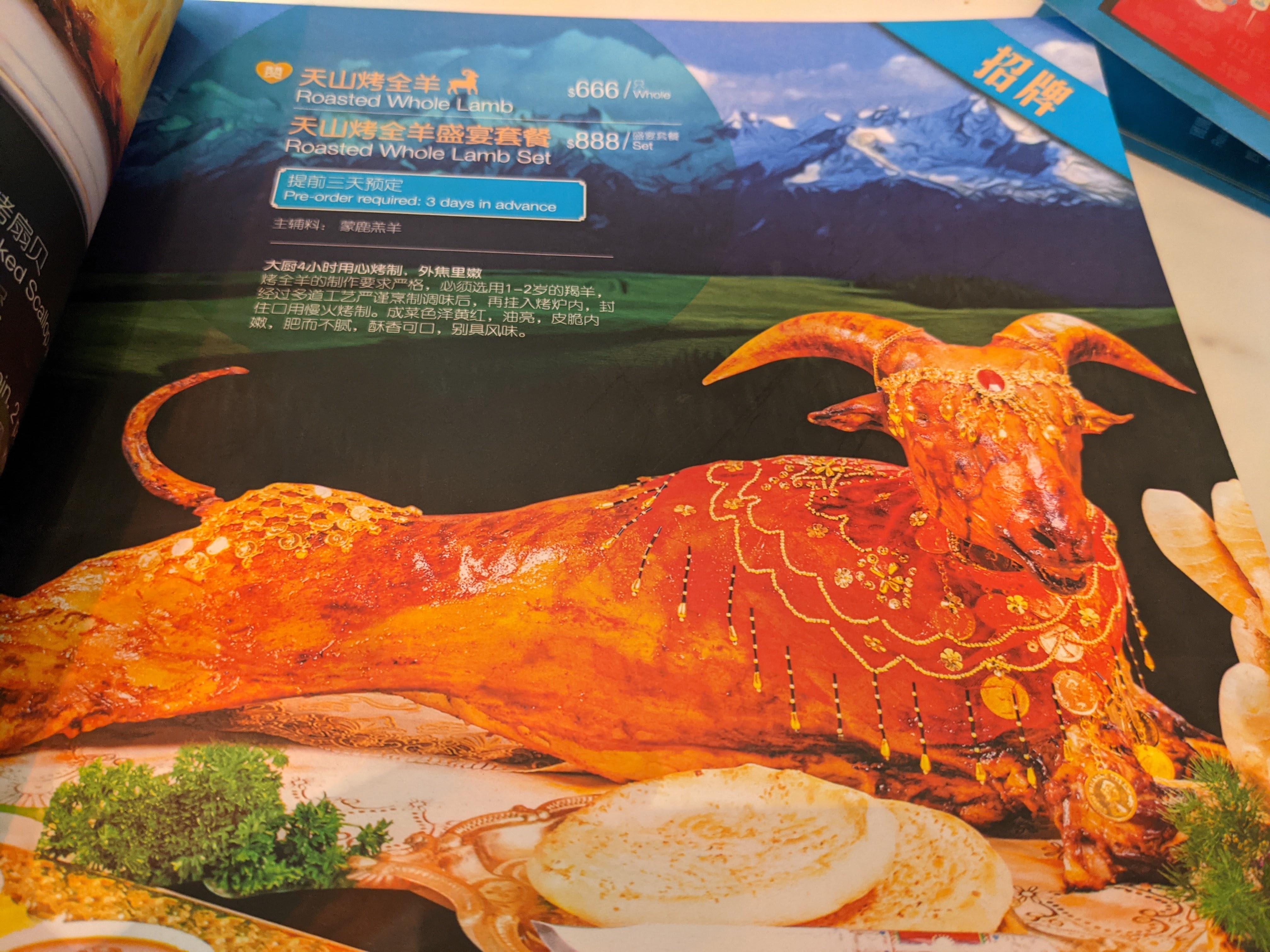 One dish we didn’t try was the roasted whole lamb, available for auspicious price of $888, but probably not selling that well in these COVID-constrained times of groups up to 8. I wonder if they actually dress it up with gold jewelry as shown in the brochure?