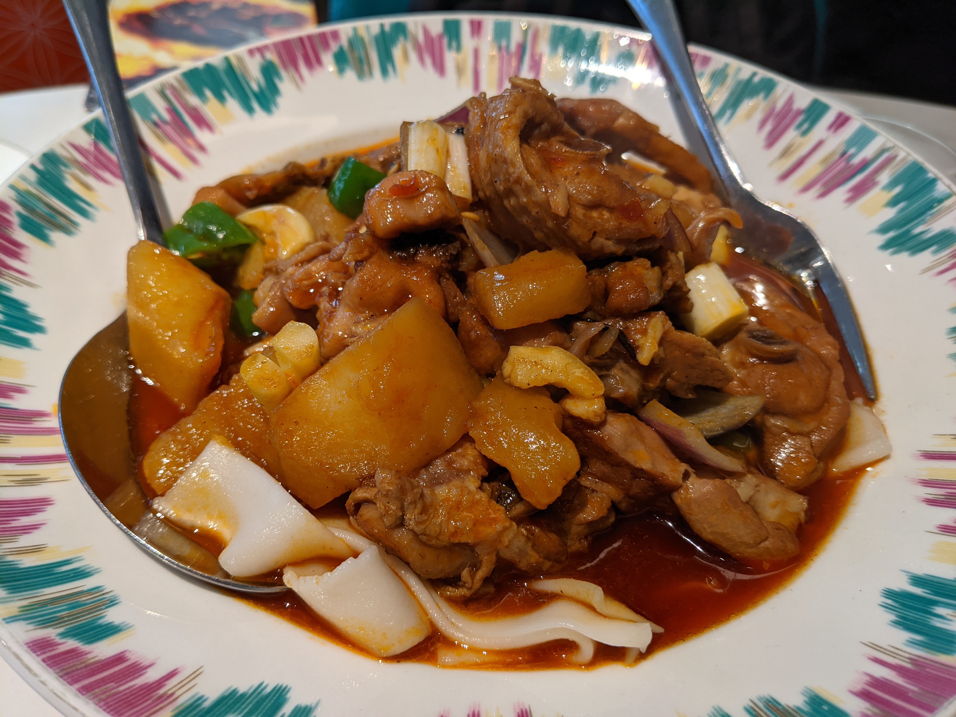 However, we struck to their self-proclaimed Xinjiang specialties and were pleasantly surprised. The mutton-laden polu cooked to order in a clay pot was oily and yummy, the nan was made fresh, the pickles were zingy and crunchy, and the kids devoured the kebabs and asked for more. All agreed the star of the show was the one Xinjiang dish the Uyghurs don’t usually get credit for, namely “big plate chicken” (大盘鸡 dàpánjī), a hearty stew of chicken, potatoes, and laghman noodles all slathered in oil and spicy-numbing mala sauce, reputedly invented by Sichuanese truckers to keep them going during the tedious 4,000-km drive from Beijing to Kashgar.