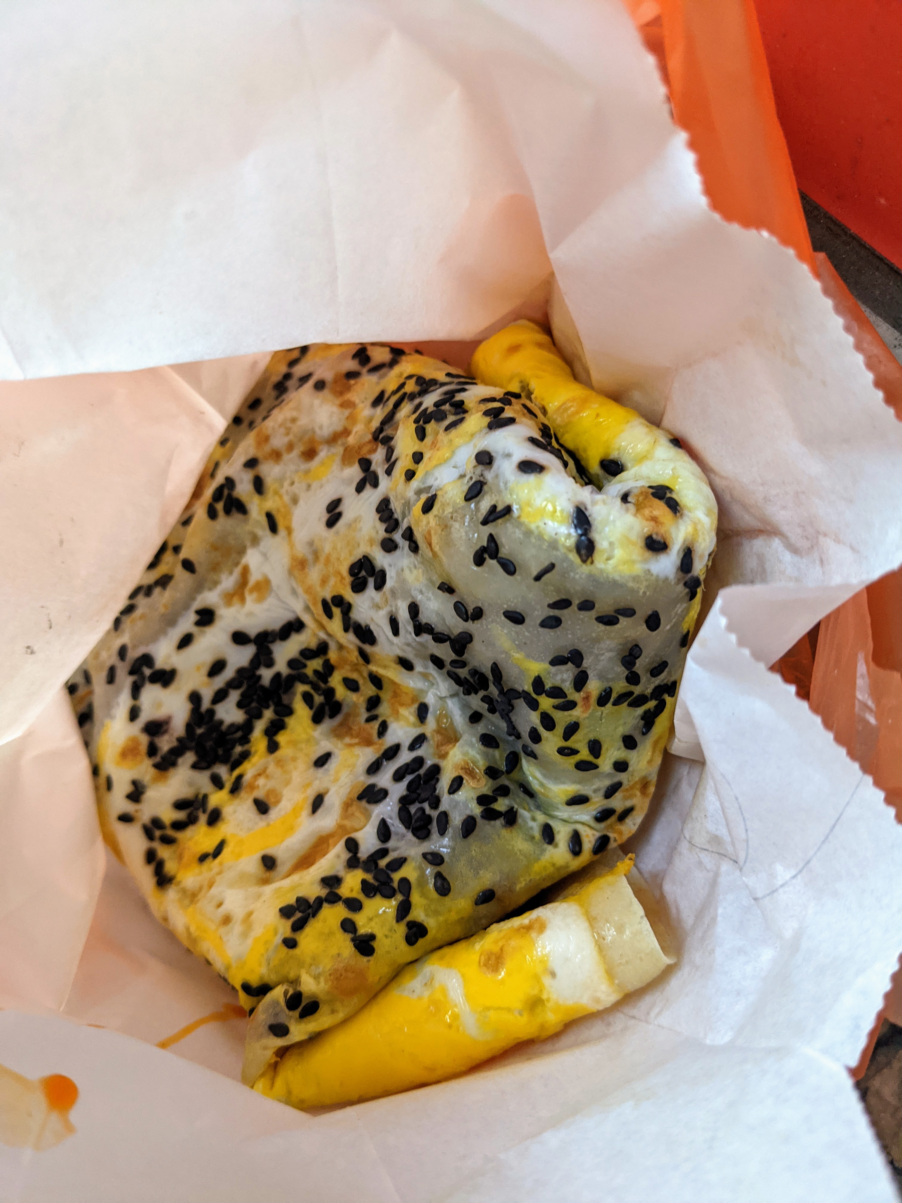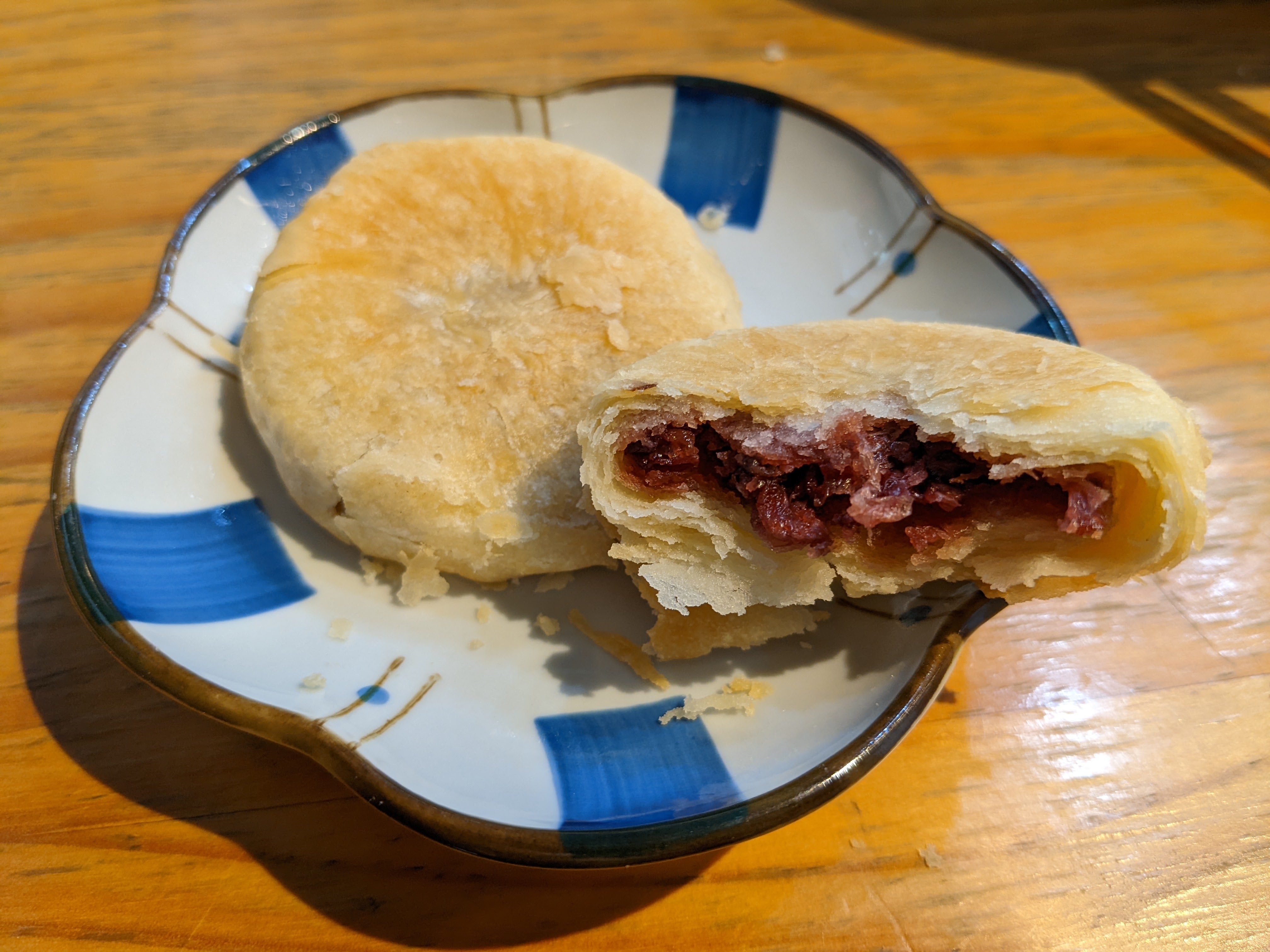 There are a couple of other interesting Yunnanese dishes on the menu, and after some deliberation I landed on the Rattan Pepper Chicken Rice Noodle (藤椒鸡米线 téngjiāo jī mǐxiàn), despite being warned no less than three times that “It’s spicy! Very spicy!” Rattan pepper here refers to Zanthoxylum armatum, known as green Sichuan pepper (麻椒 májiāo) in its typical dried spice form, but in Yunnan the fresh pods, téngjiāo (藤椒), are eaten as is. The pods look like tiny capers and have very little taste, but they crack open with a crunch and release a pop of the numbing má (麻) sensation Sichuan cuisine is famous for. And you’ll need all the numbing you can get, since those innocuous reddish-orange bits in the soup are fresh bird’s eye chillis aka chilli padi, the tiny little torpedoes of pain that spice up authentic Thai food. The spice was not completely overwhelming though, and the chicken, garlic chives, bean sprouts and other bits in the soup stood up to the pounding. Afterwards, I could still feel the slow burn in my stomach and a nice endorphin high kicked in, the way it used to when eating Thai food in Bangkok with my Thai colleagues. Ah, nostalgia. A final Middle Eastern exclamation mark was added by the Flower Cake (鲜花饼 xiānhuā bǐng), crumbly biscuits flavoured with a sweet, fragrant paste of glutinous rice and dark purple rose syrup, reminiscent of Turkish delight (lokum).