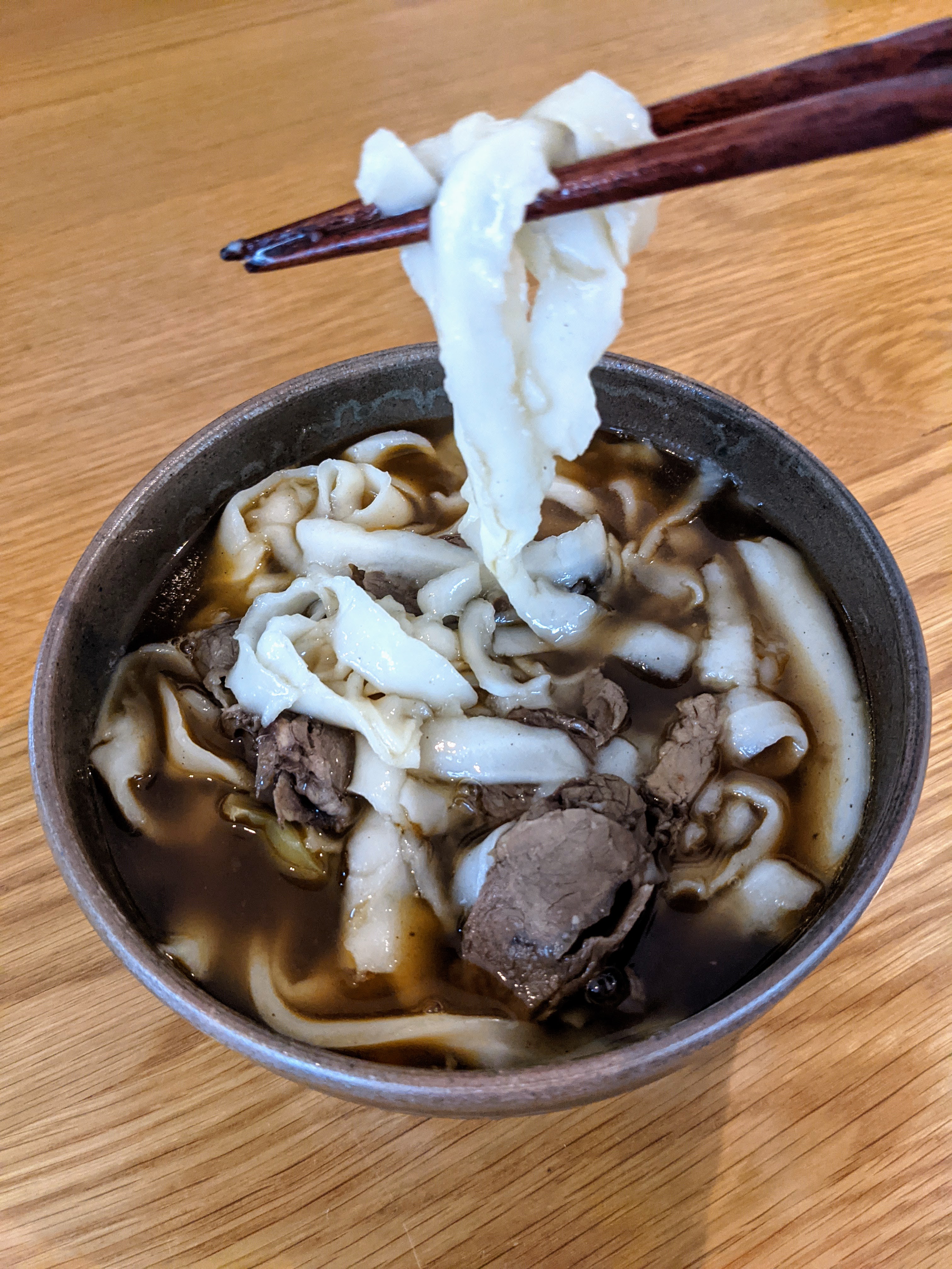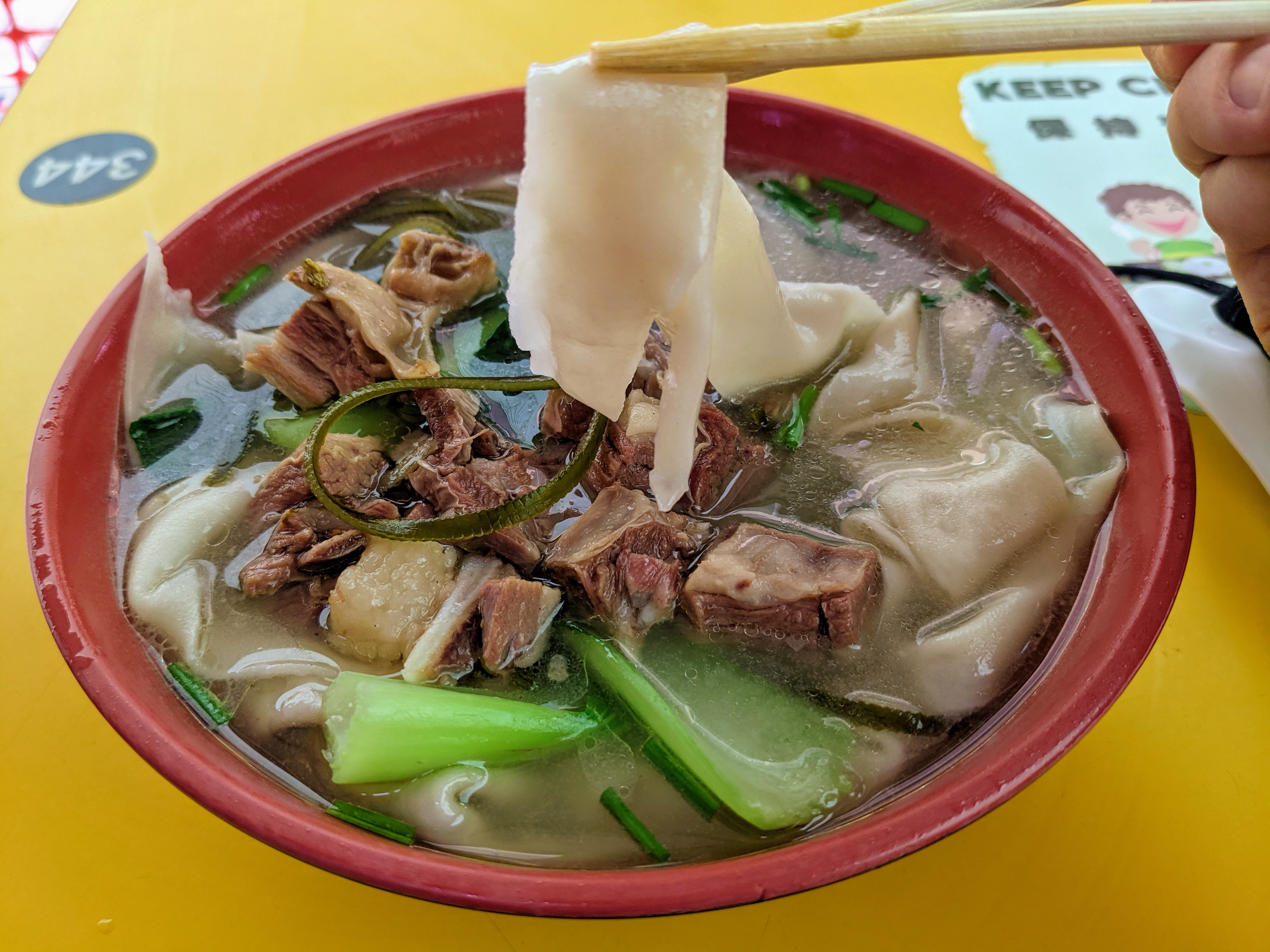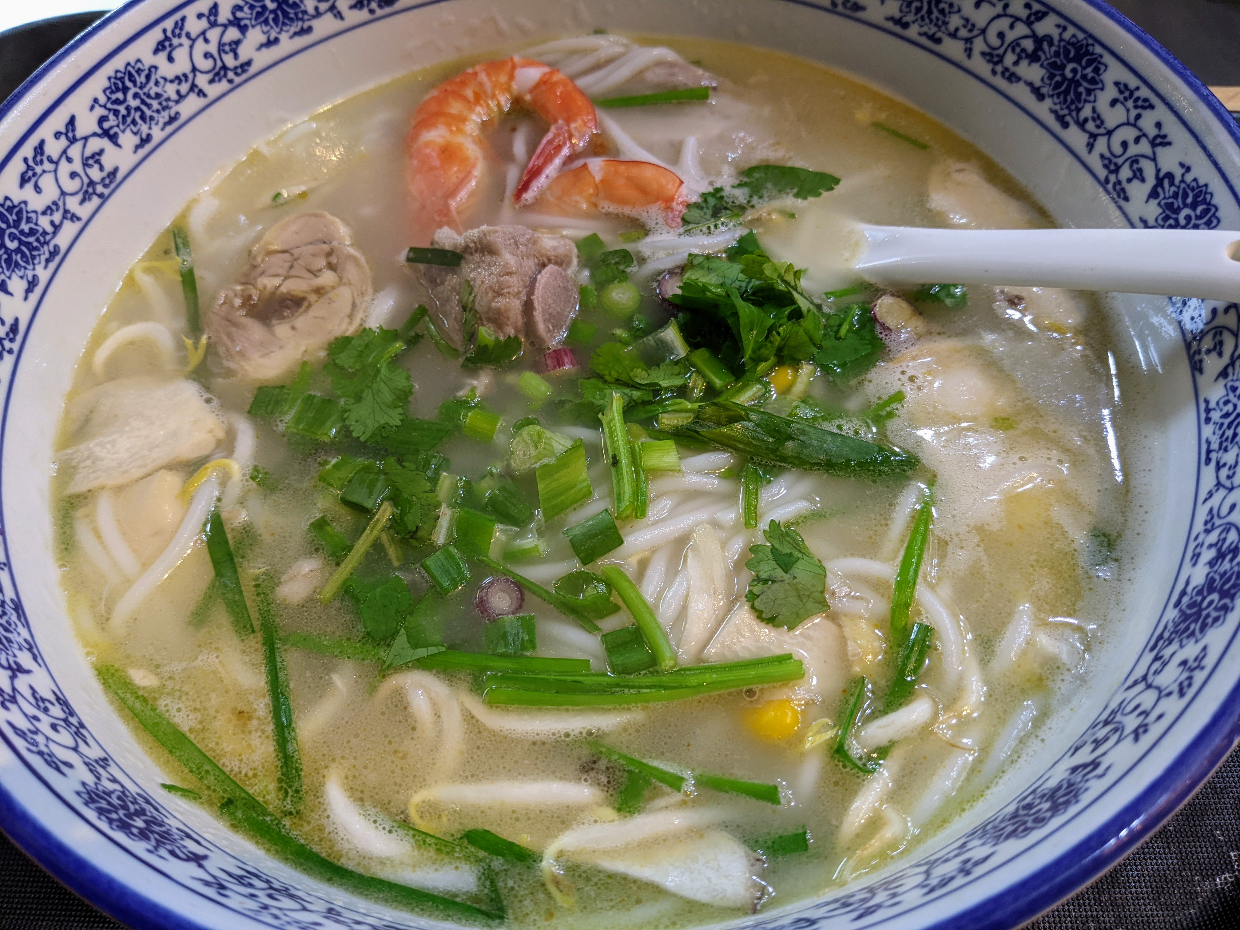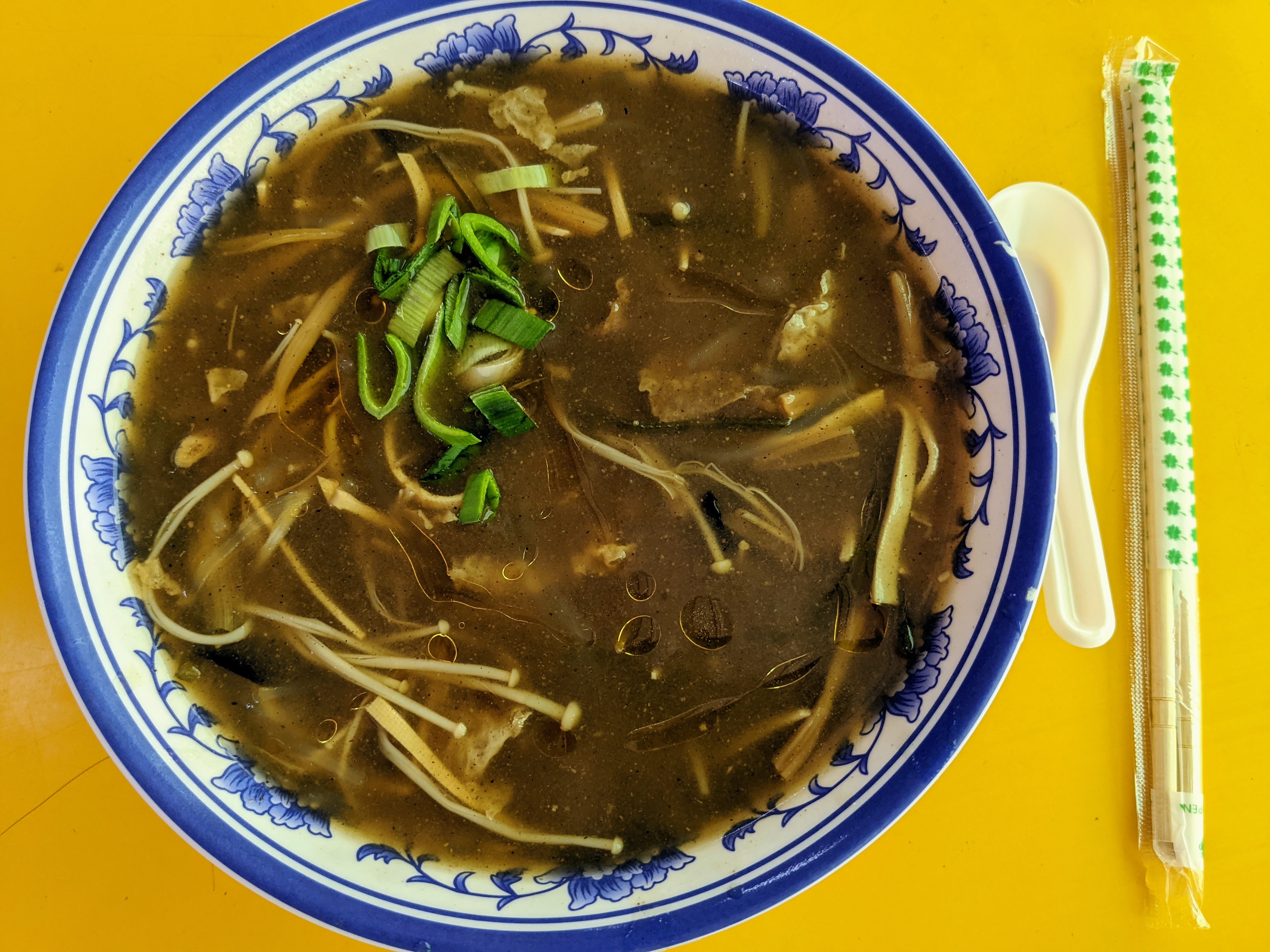 The most famous Yunnanese dish, though, is crossing the bridge noodles (过桥米线 guòqiáo mĭxiàn), which come with a lovely if implausible story of a wife making soup for her husband studying on a little island. She brought the ingredients across separately to keep them warm, mixed the ingredients on arrival, and ta-dah, the soup was born, despite the anguished cries of physics students noting that maximising surface area will increase heat loss, not decrease it. Honguo (红锅 Hóngguō, “Red Pot”) is one of several small chains specialising in this in Singapore, and I tried out the Signature 12-Item Soup ($10.20) at their Bugis Junction outlet. The presentation is striking, and the Pot is indeed Red, but the taste was a little anticlimactic, the ingredients a frankly odd mishmash of pork, fish, shrimp etc and the chicken soup rather nondescript, salty and, fatally, only lukewarm. Not very impressed.