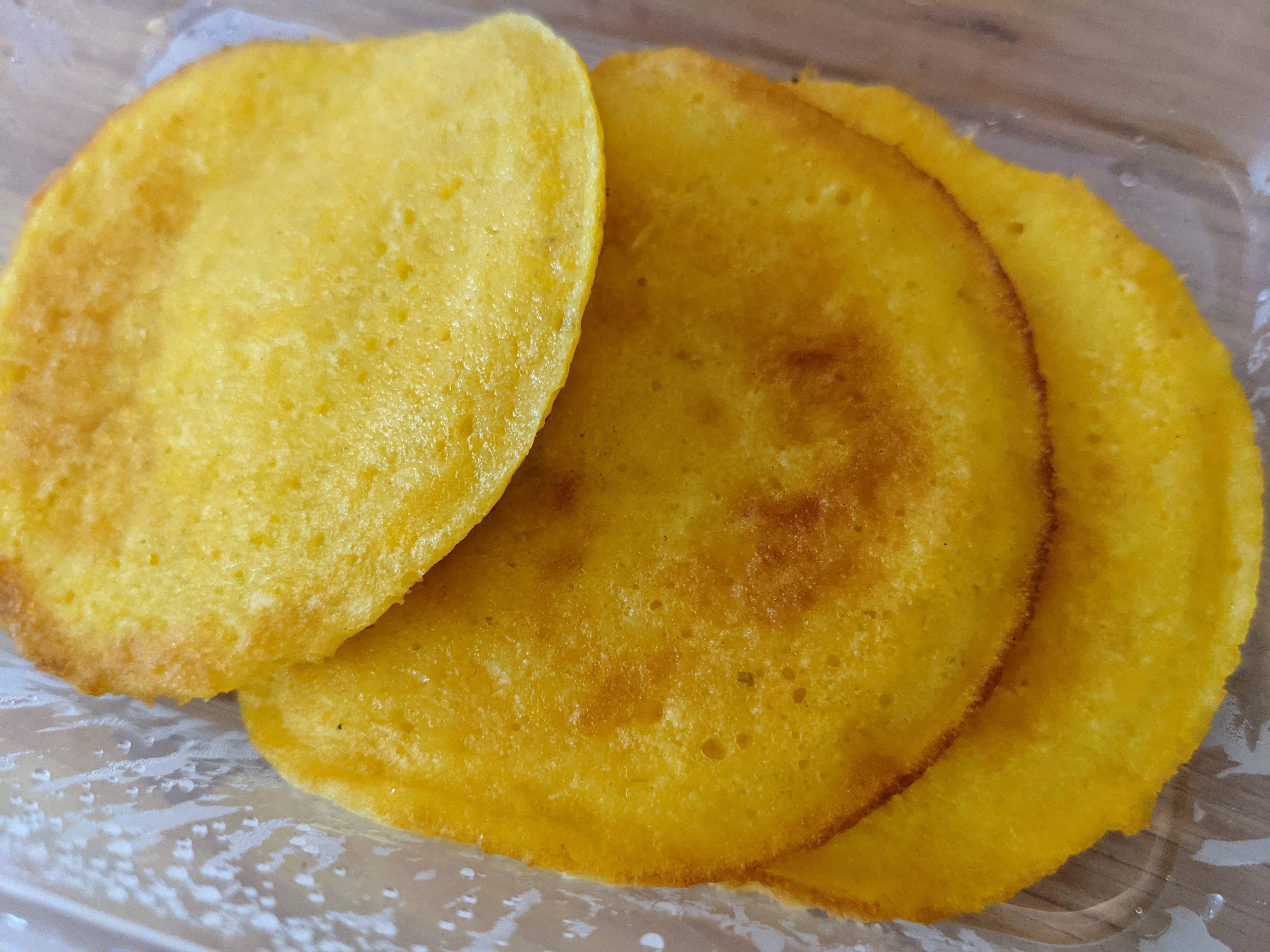 The most unusual ingredient of the day was in the Sauteed Asparagus with Golden Fungus and Mushrooms (金耳花菇炒芦笋), where the “Golden Fungus” is Tremella aurantialba, a jelly fungus so obscure it doesn’t even have a picture on Wikipedia. Called golden ear (金耳 jīn’ěr) in Chinese, it’s a relative of the much more common snow fungus aka silver ear (银耳 yín’ěr). But whereas the snow fungus is thin, crunchy and ethereal, this looks disturbingly brain-like, has a spongy texture and tastes like nothing much. The still crispy asparagus was nice though. To wash it all down we had a bowl of Steampot Chicken Soup (汽锅鸡), apparently the chain’s signature dish and a Yunnanese classic but, I’m sorry to say, quite indistinguishable from the herbal chicken soup sold at your neighbourhood hawker centre, a few bony chunks of chicken in nondescript sweetish soup with a token wolfberry for colour. For dessert we had some Corn Cakes (玉米粑粑 yùmǐ bābā), supposedly a type of Naxi baba bread, which looked and tasted like sweet pancakes with corn chowder added to the batter. All in all, even making allowances for delivery, it was a pretty mixed bag at best.