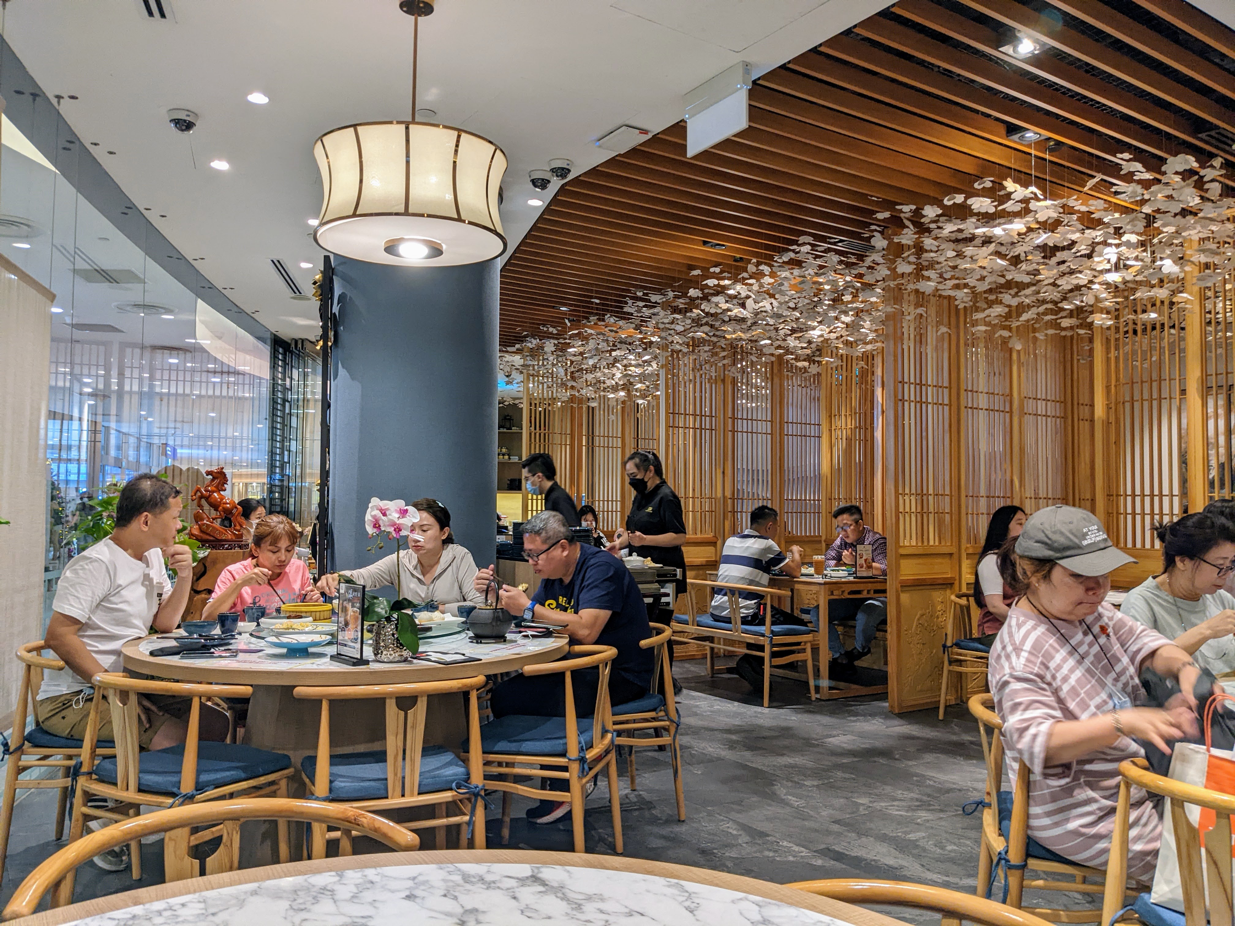 Next stop was Crystal Jade Jiang Nan (翡翠江南) in Vivocity, a themed outlet of the ubiquitous Singaporean chain. The restaurant is pretty dapper for a shopping mall, with the latticed wood booths topped by hundreds of fluttering flower cutouts particularly appealing. The menu is “inspired by” (always a dangerous phrase) “the Jiangnan and Sichuan regions”, but we steered clear of the Mala Crispy Chicken and the Mochi Cheese Balls (shudder). The Three Delicacies Platter (巧手三拼) had the Nanjing Salted Duck we already met in Jiangsu, a rather tasty take on Jiangsu Smoked Fish (江苏熏鱼) that we sample later in the Shanghai episode, and Spinach with Sesame Sauce (麻酱波菜鲜百合) that tasted an awful lot like the classic Japanese cold dish of hōrensō no goma-ae. A quick Google was inconclusive, but given that spinach is a reasonably recent import to Japan (1800s?), the two dishes may well be related.