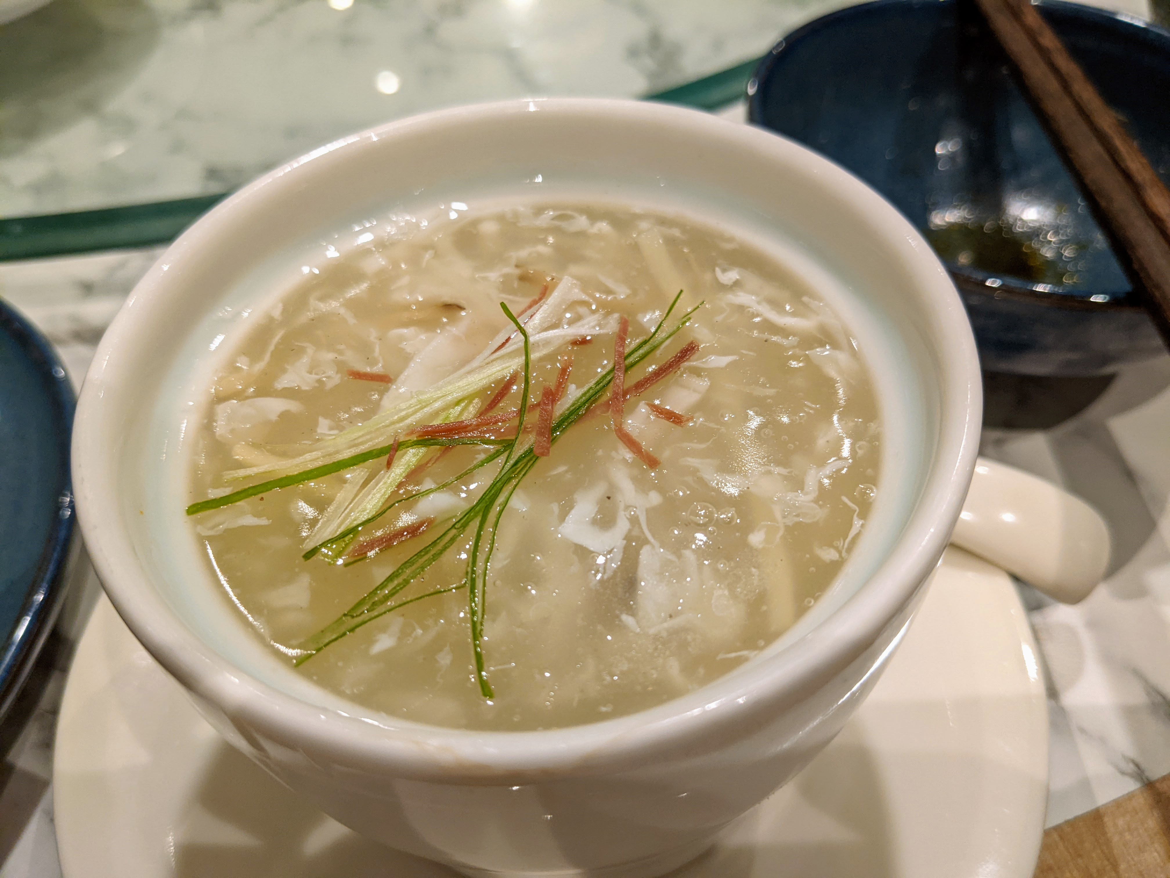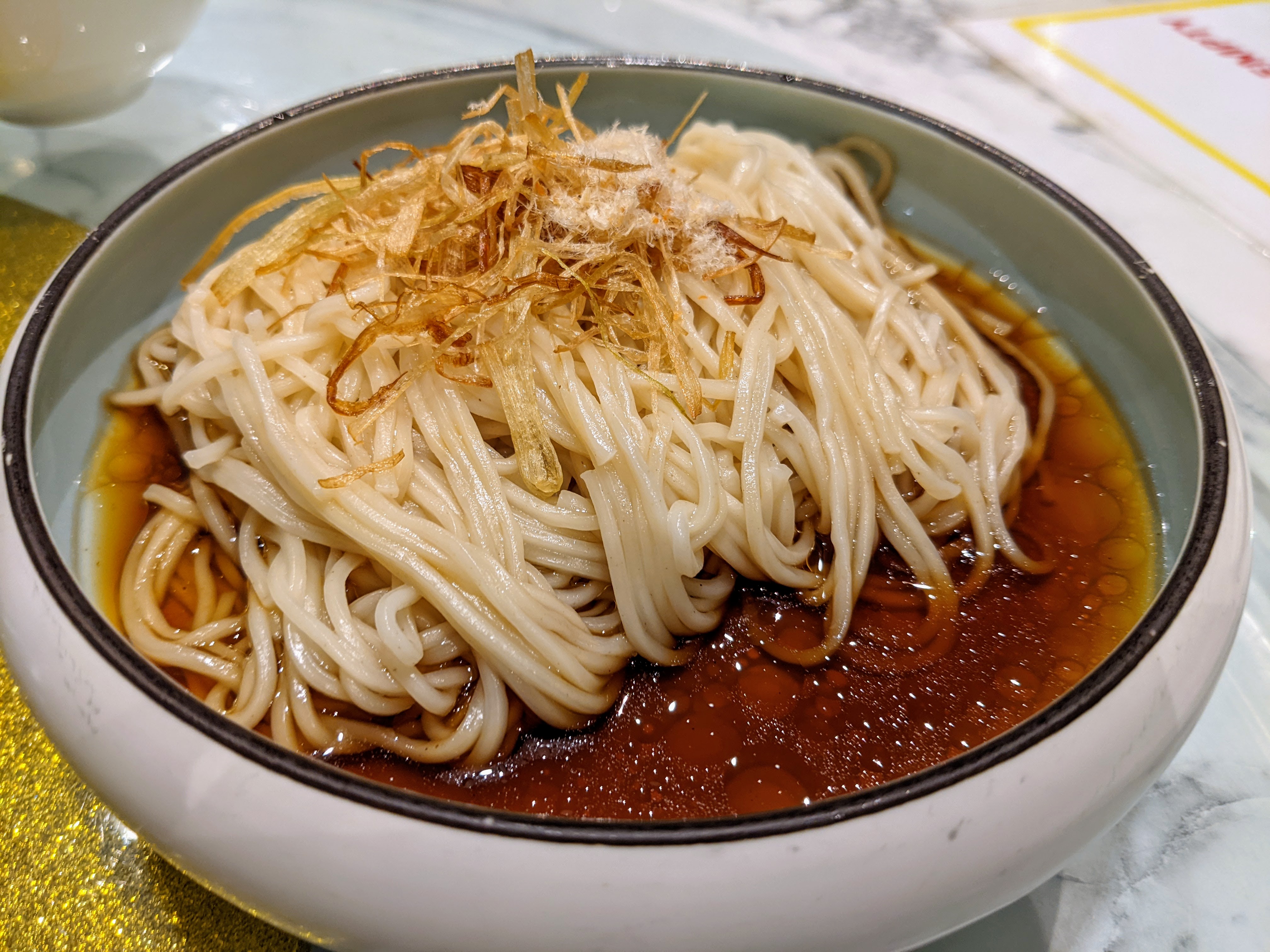 The one indubitably Zhejiang dish on the menu was Sister Song’s Thick Fish Soup (宋嫂鱼羮). Per legend, in 1197 Emperor Gaozong was out for a spin on Hangzhou’s West Lake when he felt a bit peckish and ordered some fish soup from a lady called Song Wusao, and the rest is history. It’s a deceptively simple-looking starchy soup that hides a light but complex flavour: shreds of white fish and egg white, julienned bamboo shoot, ginger and ham, a touch of vinegar, quite a bit of white pepper and a touch of Shaoxing wine (绍兴酒), commonly used as cooking wine in countless Chinese dishes but originating from Shaoxing, Zhejiang. Very moreish. Less Zhejiang but an unexpected hit with the kids was the Scallion Oil Noodles (葱油面), an even simpler Shanghai dish: hand-pull lamian noodles, fry slivered scallion in oil, combine and enjoy. And we rounded things out with Crystal Jade’s signature xiao long bao dumplings, another tasty Shanghai dish, and pan-fried shengjianbao, which unfortunately were soupless and sad. (More about both in the Shanghai episode.)