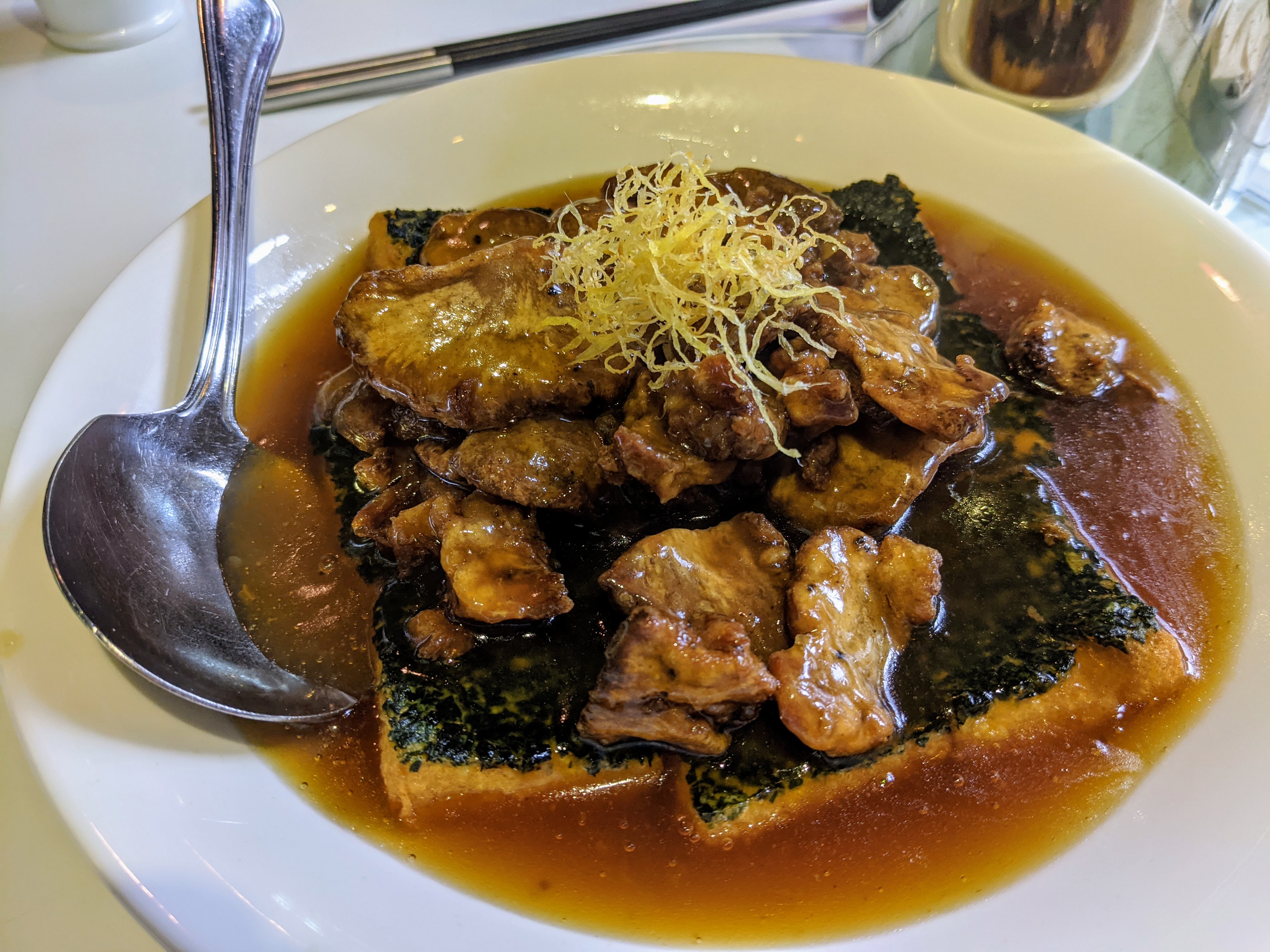 Just about the only other Beijing dish on the menu was pan-fried dumplings (锅贴 guōtiē), and the kids worked their ways through two plates so fast I didn’t even get a chance to sample them. Honorable mention goes to the Braised Spinach Beancurd with Monkey Head Mushroom (猴头菇扒翡翠豆腐), a Tung Lok invention with a less than appetizing English name, where homemade tofu is paired with crispy minced spinach and meaty pieces of Hericium erinaceus. Dare I suggest a rebrand to “Jade Tofu with Lion’s Mane”? For the eight of us with tea & desserts but no alcohol, total damage came to a surprisingly reasonable $40/head.