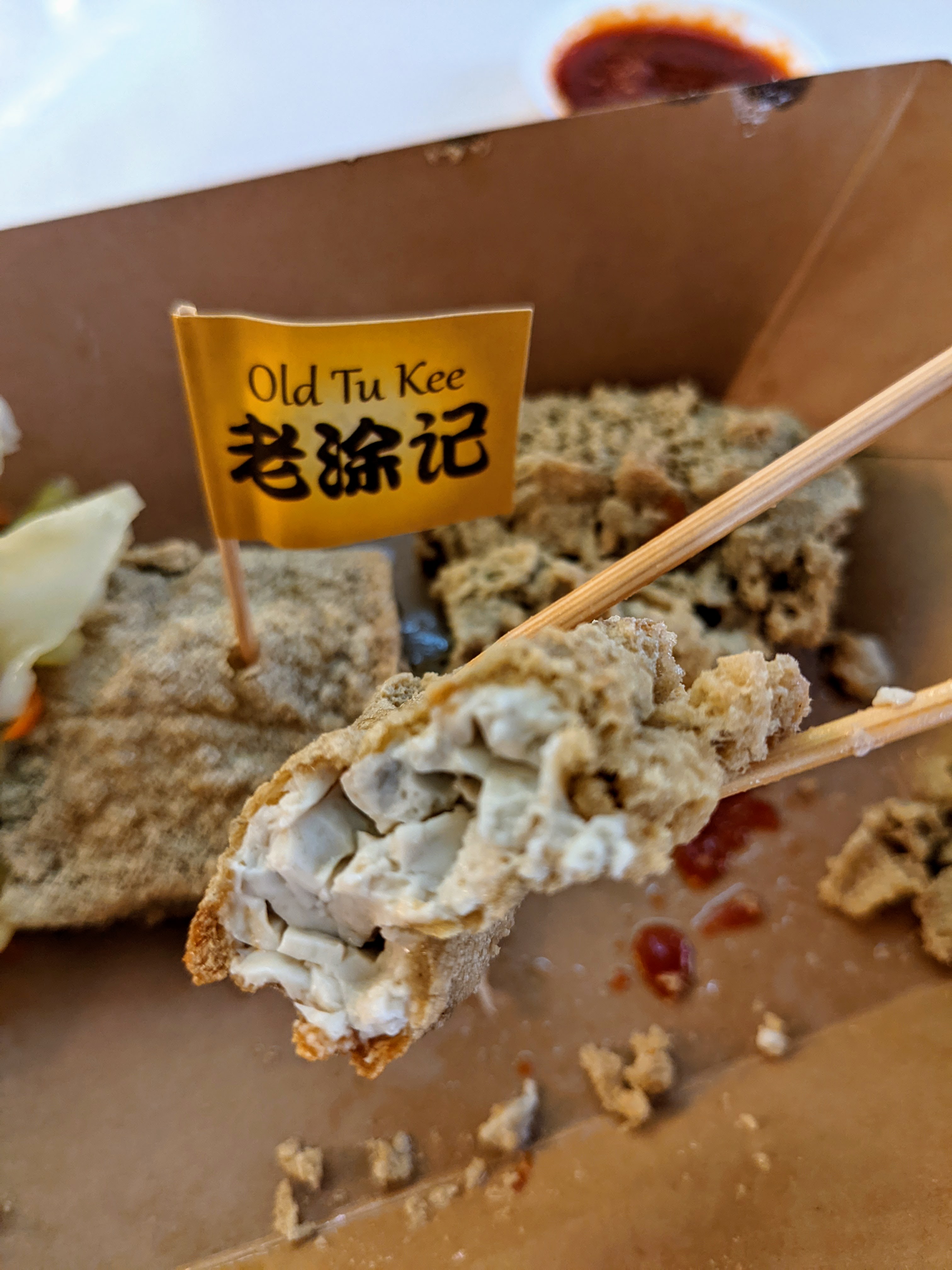 So how? To my surprise, my nose barely noticed: you can usually smell a stinky tofu joint before you see it, but here l’odeur de toilette was barely perceptible, more a whiff of a fart than a portapotty at a burrito festival. The Instagram-friendly serving complete with flag was cooked to order (I was customer #4 today), very crispy/crumbly on the outside and soft on the inside. The tofu was an off-white greyish color, but still reasonably firm, with a hint of a funky, slightly sour aftertaste that haunted my burps for the next hour or so afterward. The chilli sauce was quite mild, but cut the oil nicely, as did the pickled cabbage served on the side. All in all, inoffensive and quite edible, but I’m unlikely to become a regular.