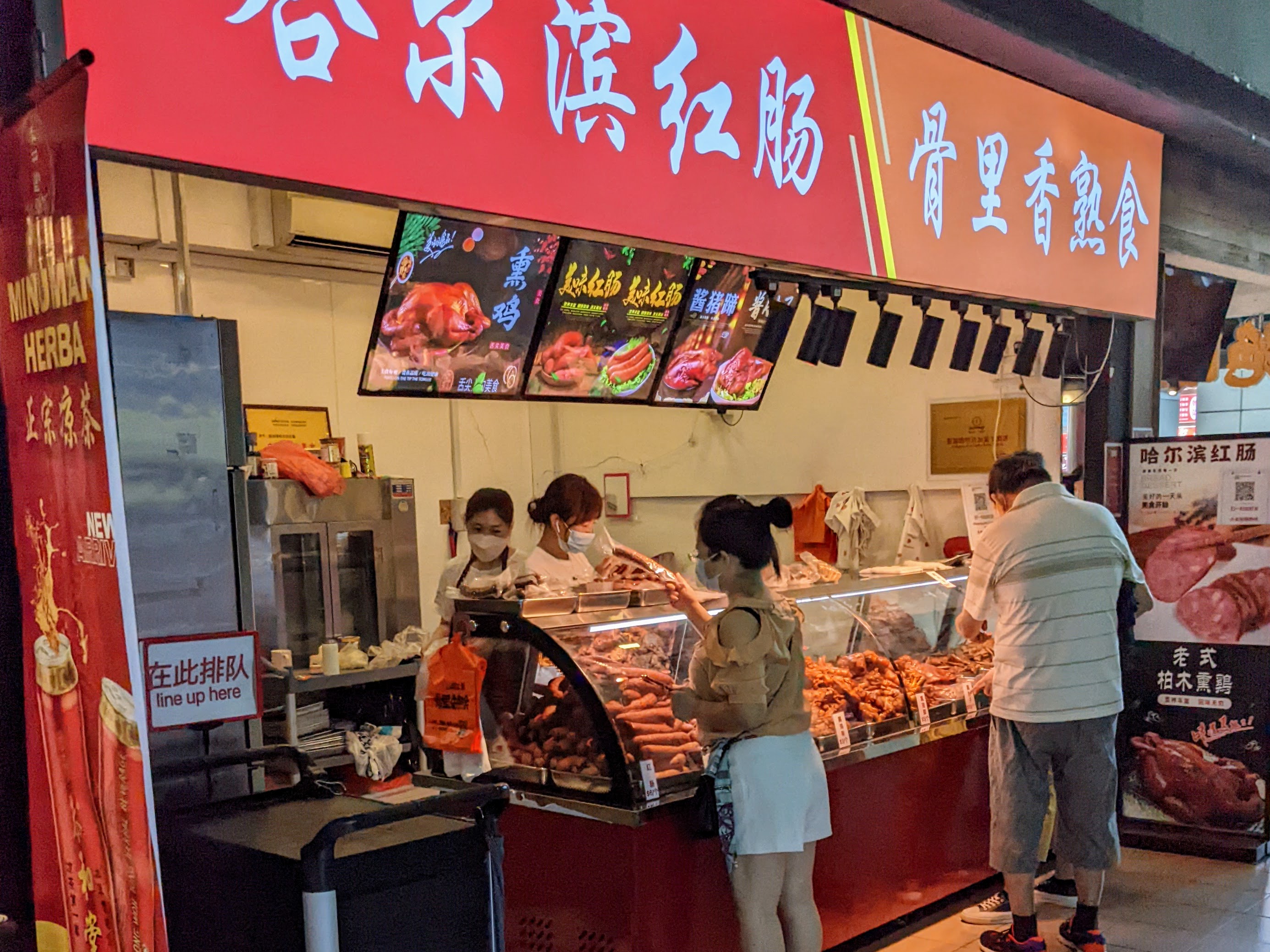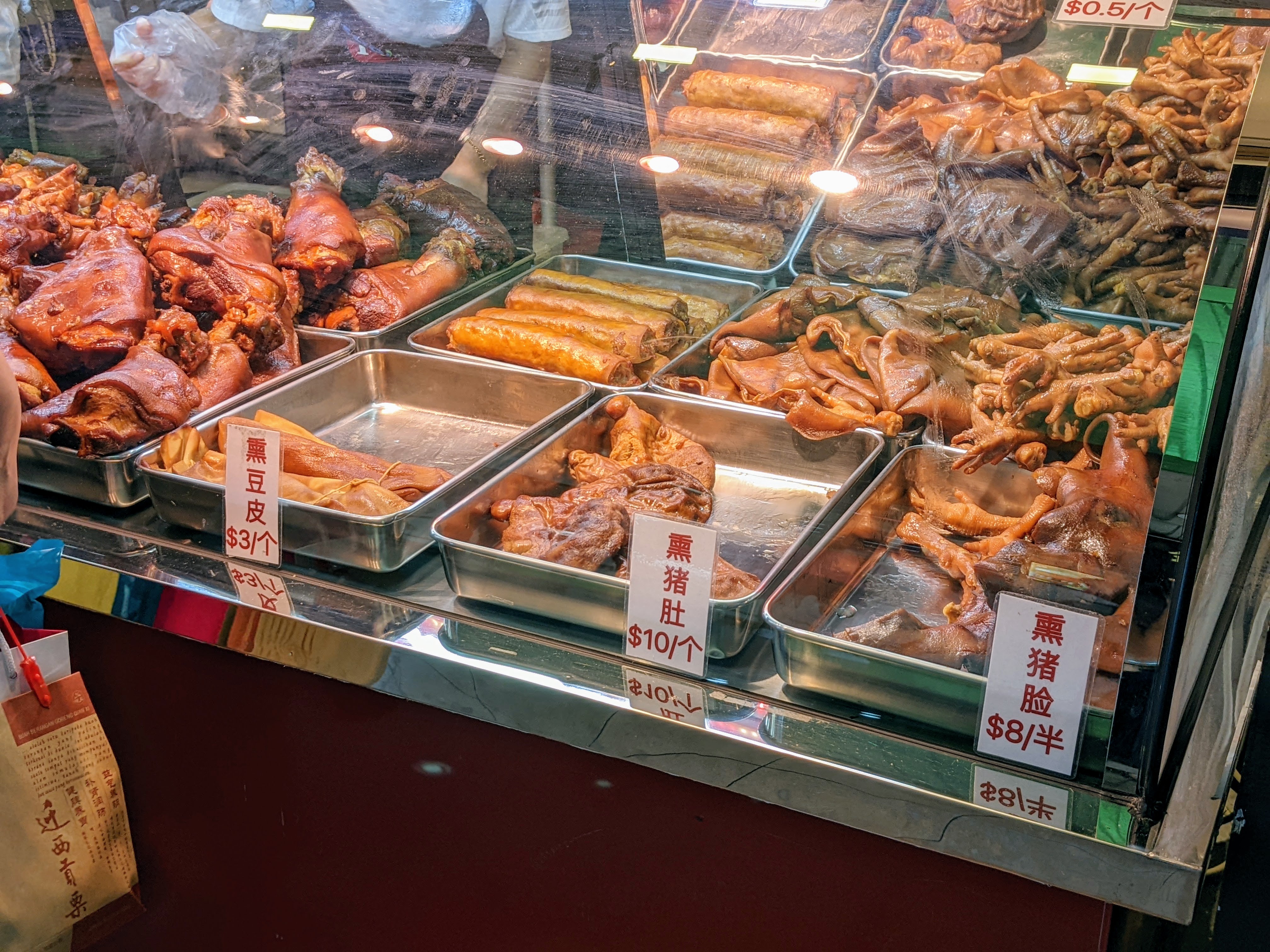 To cleanse my tastebuds and nostrils, I headed to the only actual Anhui shop I could find in the country, namely Gulixiang Cooked Food (骨里香熟食 Gǔlǐxiāng shúshí) at People’s Park. Hailing from Fuyang, Anhui, the franchise’s name translates to “Bone-In Fragrance”, and they’re above all known for their braised chicken dishes, braising being a classic Anhui technique (also used by half of China, it must be said). Here in Singapore, they also retail the Harbin red sausages I sampled in the Heilongjiang episode and a few odds and ends like chicken feet, but the menu is dominated by pork parts: skin, face, snout, trotters, you got it.