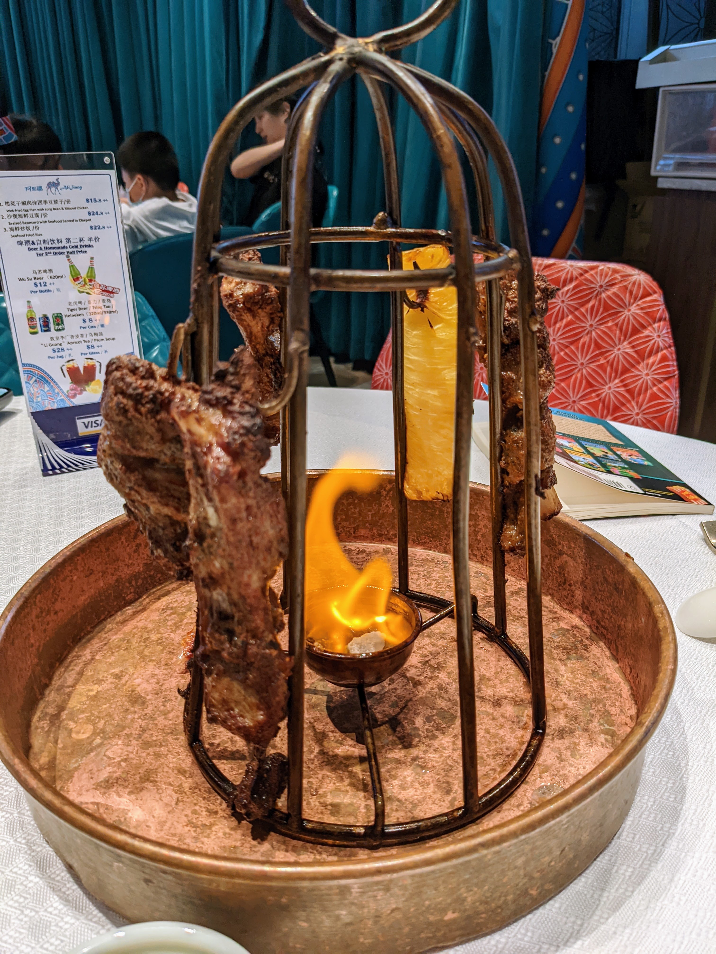 Phew! Where were we again? Ah yes, the food. In Singapore there are two Manchurian candidates to choose from, but the “Manchurian” of the Manchurian Club is an Indian concoction of deep-fried bits in soy sauce — see the Tibet episode for more on that. Fortunately there’s also Manchurian Lamb Hotpot (满族全羊铺 Mǎnzú quán yáng pù) in Smith St, Chinatown, which we visited with 34 Province Project readers Mr Lieu and Ms Y in tow. The Chinese name literally means “Manchu Complete Sheep Shop”, as is obvious the moment you open the door and are simultaneously dazzled by Manchu bling and enveloped in a cloud of boiled mutton. Ulaanbaatar flashback time! And they’re not kidding about the Complete Sheep part either, since the menu includes BBQ Lamb Penis at $3.5 a pop.