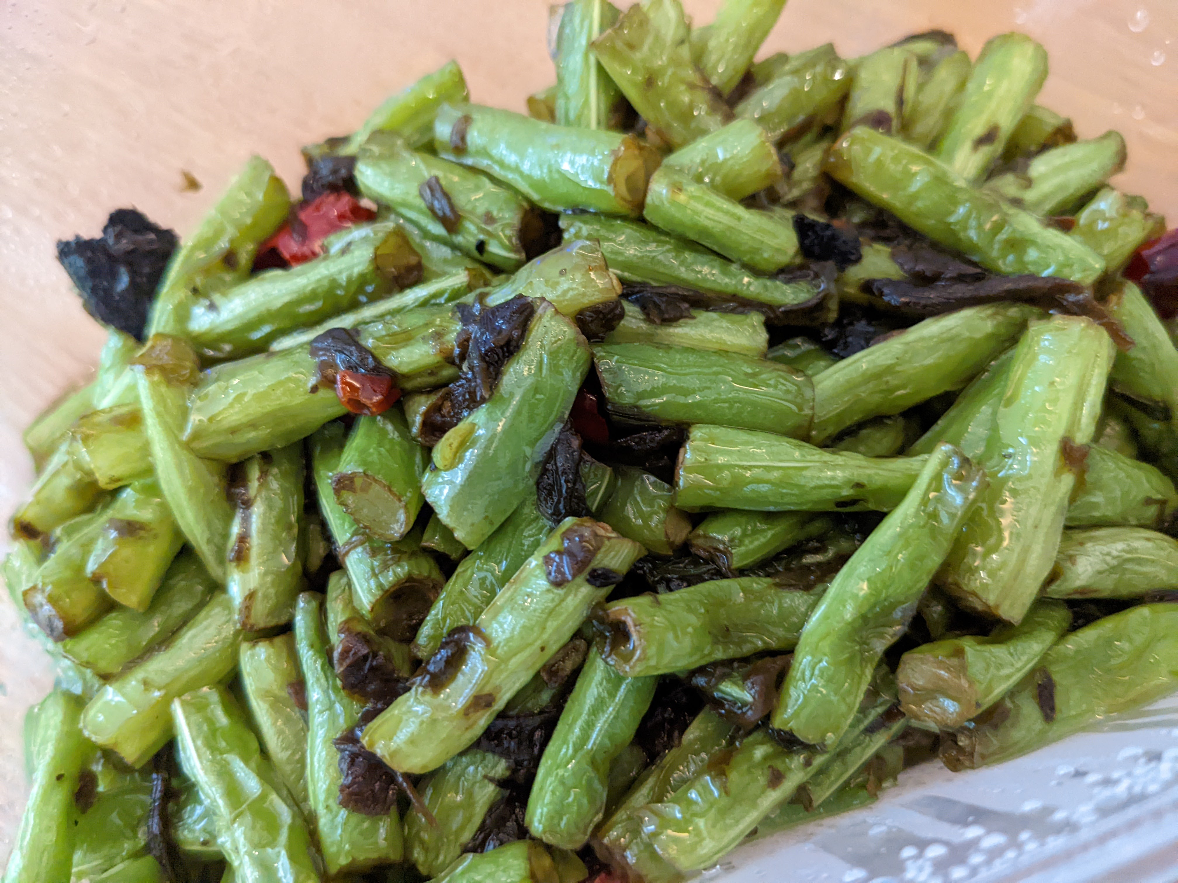 Up next was Olive Vegetable with Green Bean (橄榄四季豆). A vegetarian riff on Sichuan classic green beans with minced pork, this has nothing to do with the Mediterranean diet: the “olive” here is Canarium album (橄榄 gǎnlǎn) aka “Chinese olive”, thus named because the fruit grow in trees, are the size and shape of large olives, and can be mixed with mustard greens and fermented into a tapenade-like dark, salty, black paste simply called “olive vegetable” (橄榄菜 gǎnlǎn cài). This paste is most commonly used for porridge and fried rice, the latter a common dish particularly in Thailand, and while it doesn’t really taste like olives, it adds a nice earthy, umami kick to any dish. This was probably my favorite.