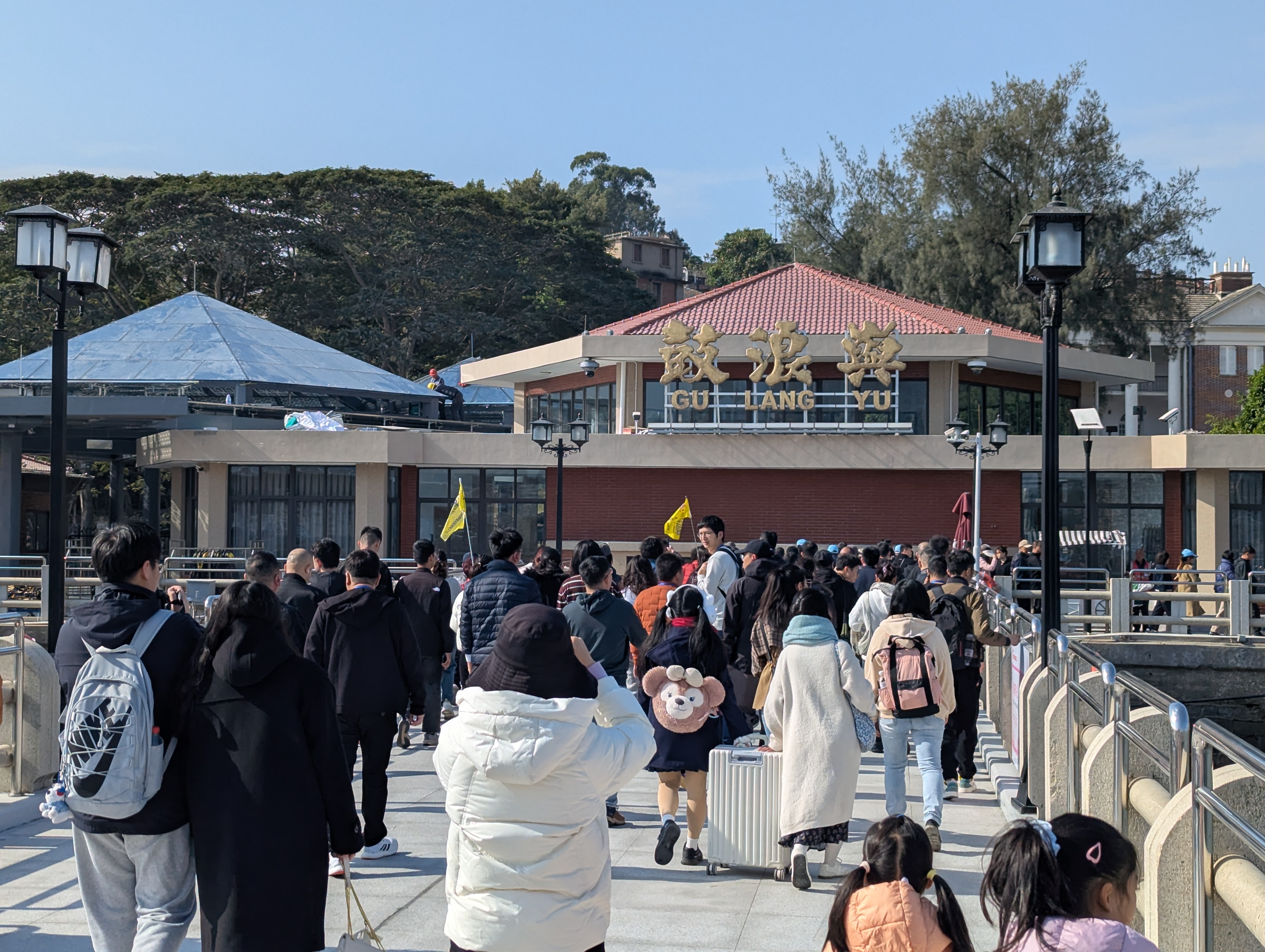 This left us with only one option: party like it’s 1999 and buy tickets in person. Since approximately nobody does this in terminally-online China, the only manned ticket counter at the massive International Cruise Center building that serves all Gulangyu tourists and approximately zero international cruises is hidden on the 3rd floor, tucked away behind cafes and teddy bear shops. Departure boards were entirely in Chinese, but I was able to pick out 三丘田 as my destination and ask for it. The grumpy lady responded with a lengthy burst of rapid-fire Chinese way above my skill level, then repeated it word for word after my tingbudong. Eventually she sighed and scribbled out 9:50 ¥80, 10:10 ¥35; she had been asking me if I wanted the fancy boat or the regular ferry. I opted for the cheaper sanshiwu kuai option and handed over our passports, and after a few more rounds of charades I was in possession of three tickets for departure in just under an hour. Fortunately it was a low-season weekday; I gather multi-hour waits or even selling out entirely is not uncommon.
