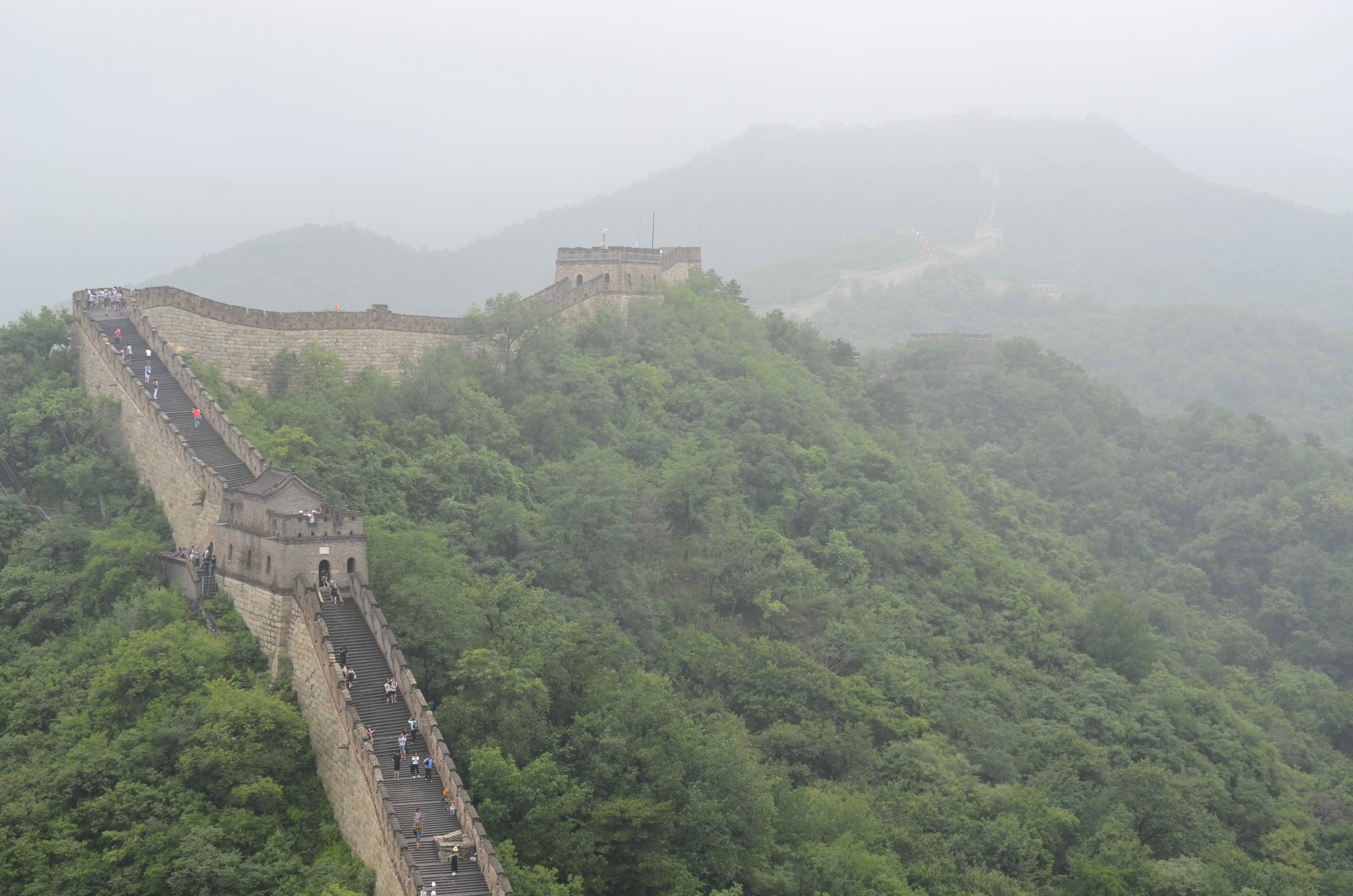 Then it was security time. Getting on this local ferry required airport-style security: queue up at the correct departure line, validate tickets against passports, put belongings through metal detector, get a half-assed patdown, then wait in a cattle pen. Boarding started 10 min before departure, but everybody queued up 30 min early in a randomly pulsating gaggle, ignoring attempts to form them into orderly queues. Yet another ticket check, down a staircase with speakers yelling XIAOXINTIJI (mind the steps) every 10 seconds, onto a standing room only ferry where an extremely high-pitched announcer proceeded to regale us with endless hype about how everything we were seeing was 中国最X (biggest/longest/oldest/… in China) until, to general amusement, the batteries in her microphone abruptly died and we got to enjoy the sight of her desperately yet unsuccessfully whacking it with her palm to make it work again. Ah, glorious silence!