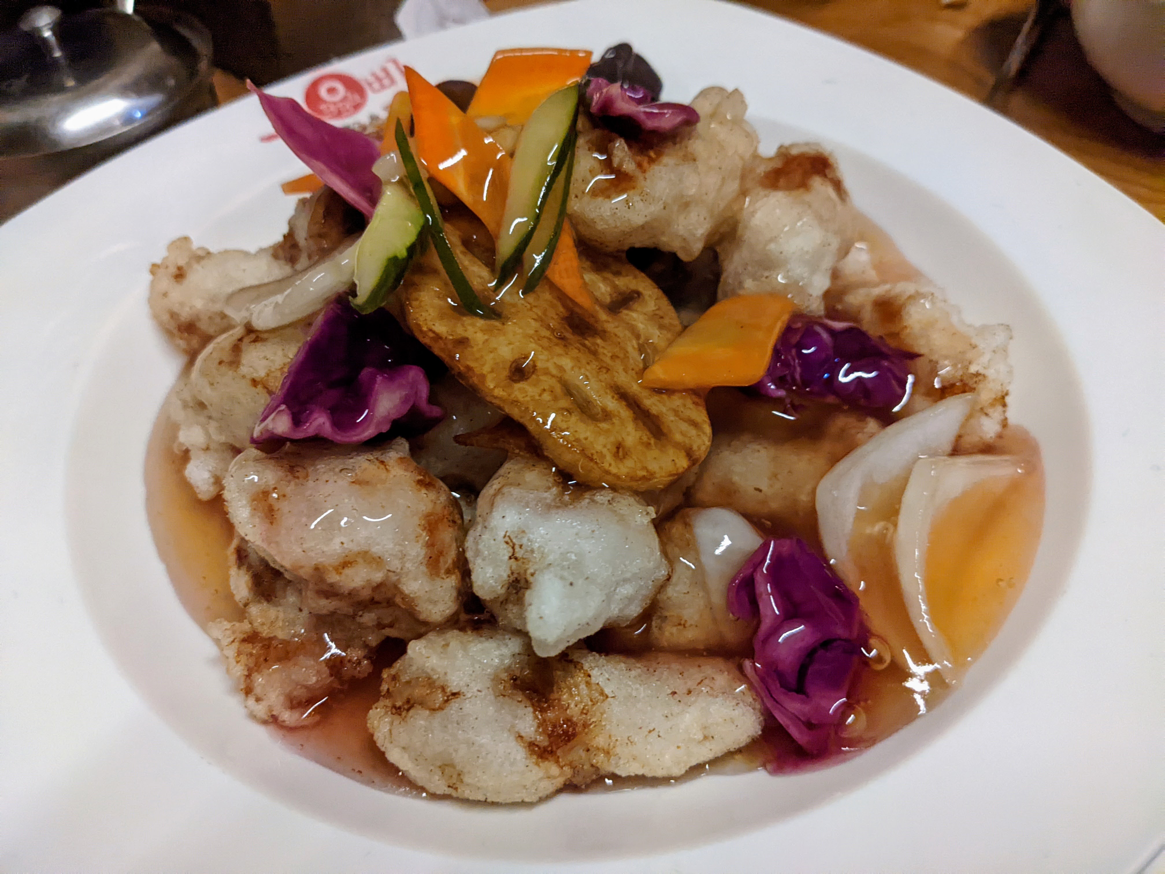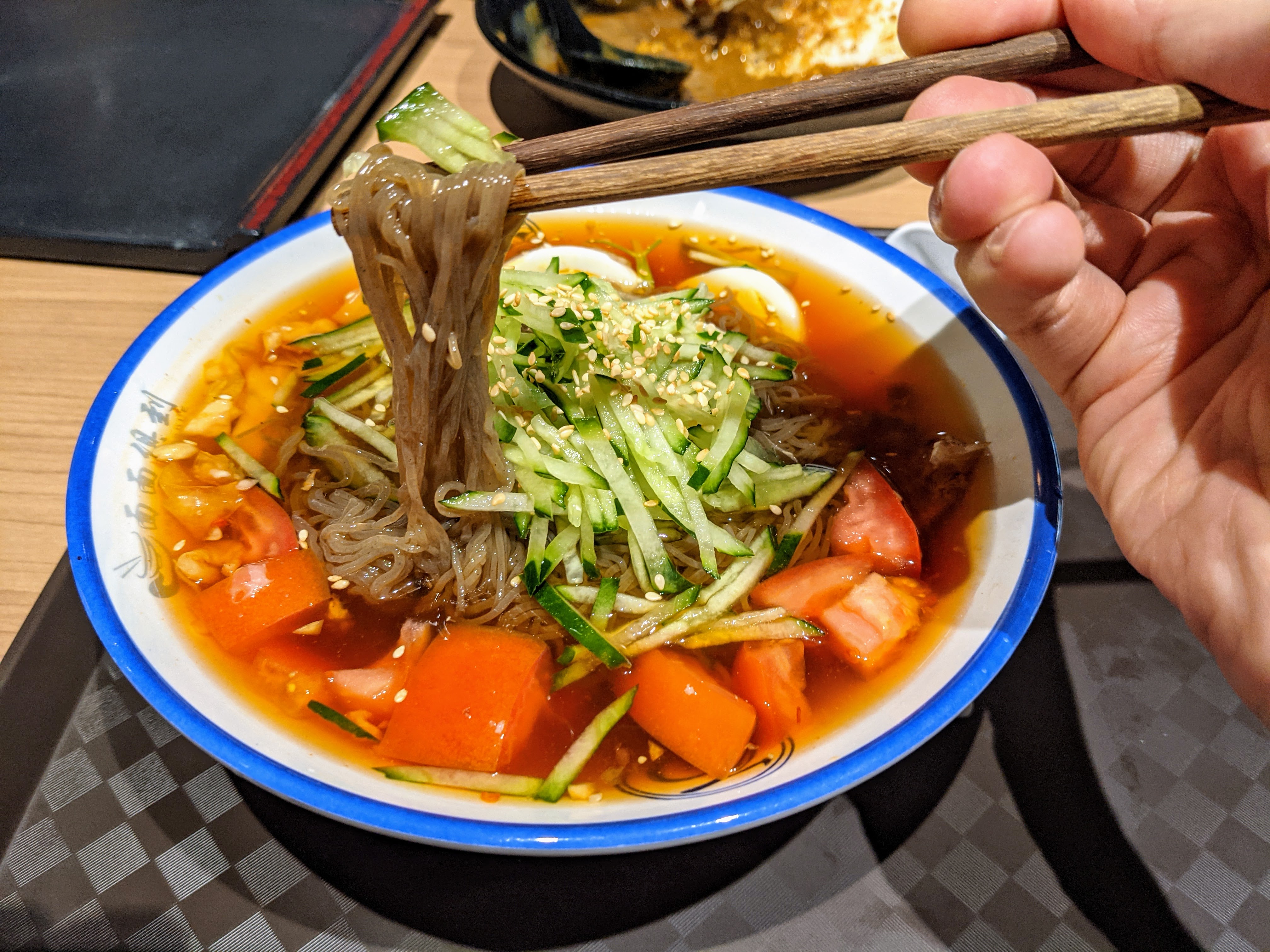 The most memorable dish of the night, though, was tangsuyuk (탕수육/糖醋肉), the Korean-Chinese take on sweet and sour pork and a cousin of the guōbāoròu we tried in the Heilongjiang episode. Strips of pork and lotus root are cooked, dipped in a very heavy potato starch batter, deep-fried, and then the pièce de résistance: the waiter comes and pours a solid half-litre of warm sweet and sour sauce over it all, with a few token veggies to assuage your guilt. Alas, while the presentation wins full points, the end result was kind of gluggy, with the meat buried in a pile of gooey starch, and I’ve never been a huge fan of sweet and sour pork anyway. (Mostly due to an epic bout of food poisoning from a way-too-cheap buffet in Kobe, but that’s another story.)