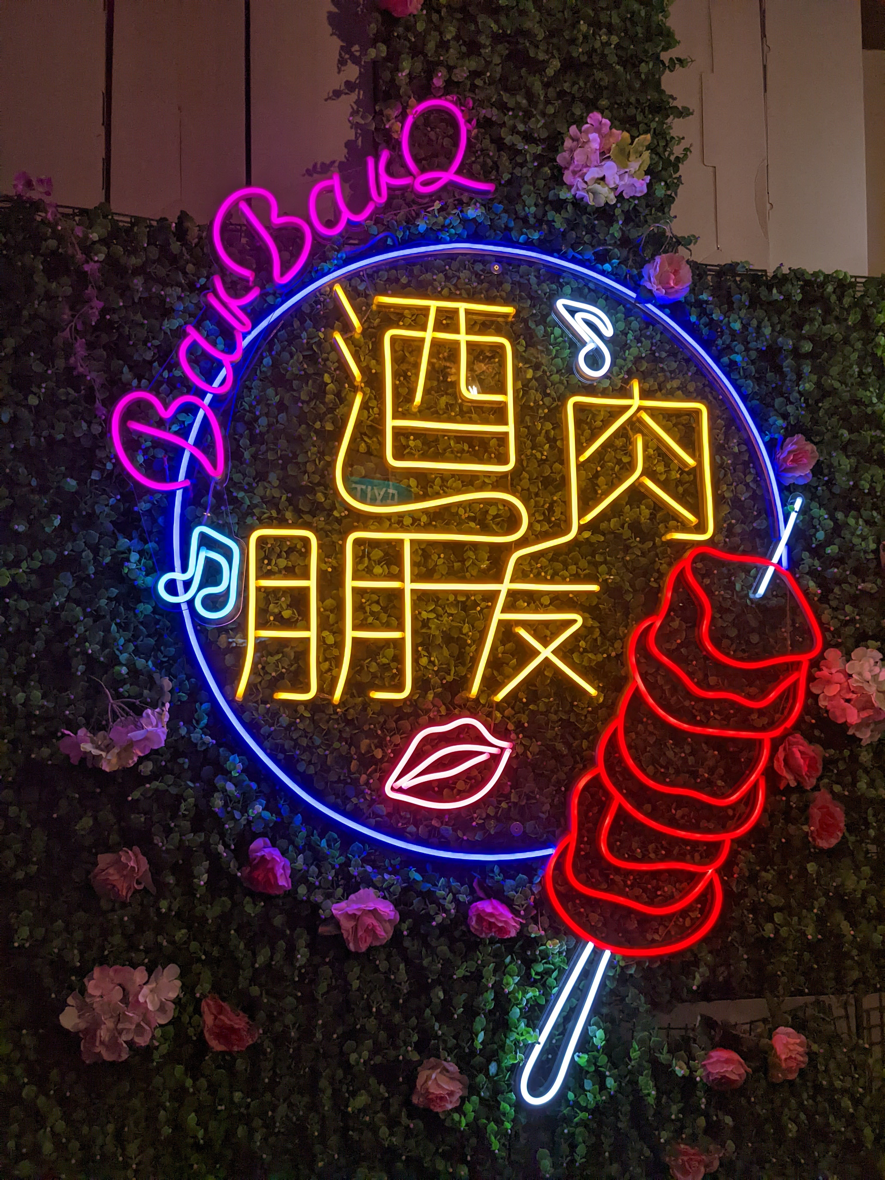 Last but not least, Bar Bar Q in Suntec has nothing whatsoever to do with Jilin, but is, at least to me, emblematic of Singapore’s next wave of Chinese-Korean fusion. (Just don’t confuse it with Pakistani kebab joint “BarBQ” or Boat Quay hangout “BQ Bar”; I’m sure all three mutually regret their branding decisions.) Originally a live music joint, the stage has been gathering dust since 2020, but at least background music is now back and it was hopping on a Friday night. Sponsored by Tsingtao Beer, with a Chinese slogan promising Wine, Meat, Friends (酒肉朋友 jiǔròu péngyǒu) and the first page of the menu devoted to classic chuan, the same Chinese kebabs we already met in Heilongjiang, you’d be excused for thinking this is yet another generic Northeastern skewer joint… but wait, why is there a lifesize leggy lady cutout advertising Jinro soju, the quintessential Korean rotgut, outside?