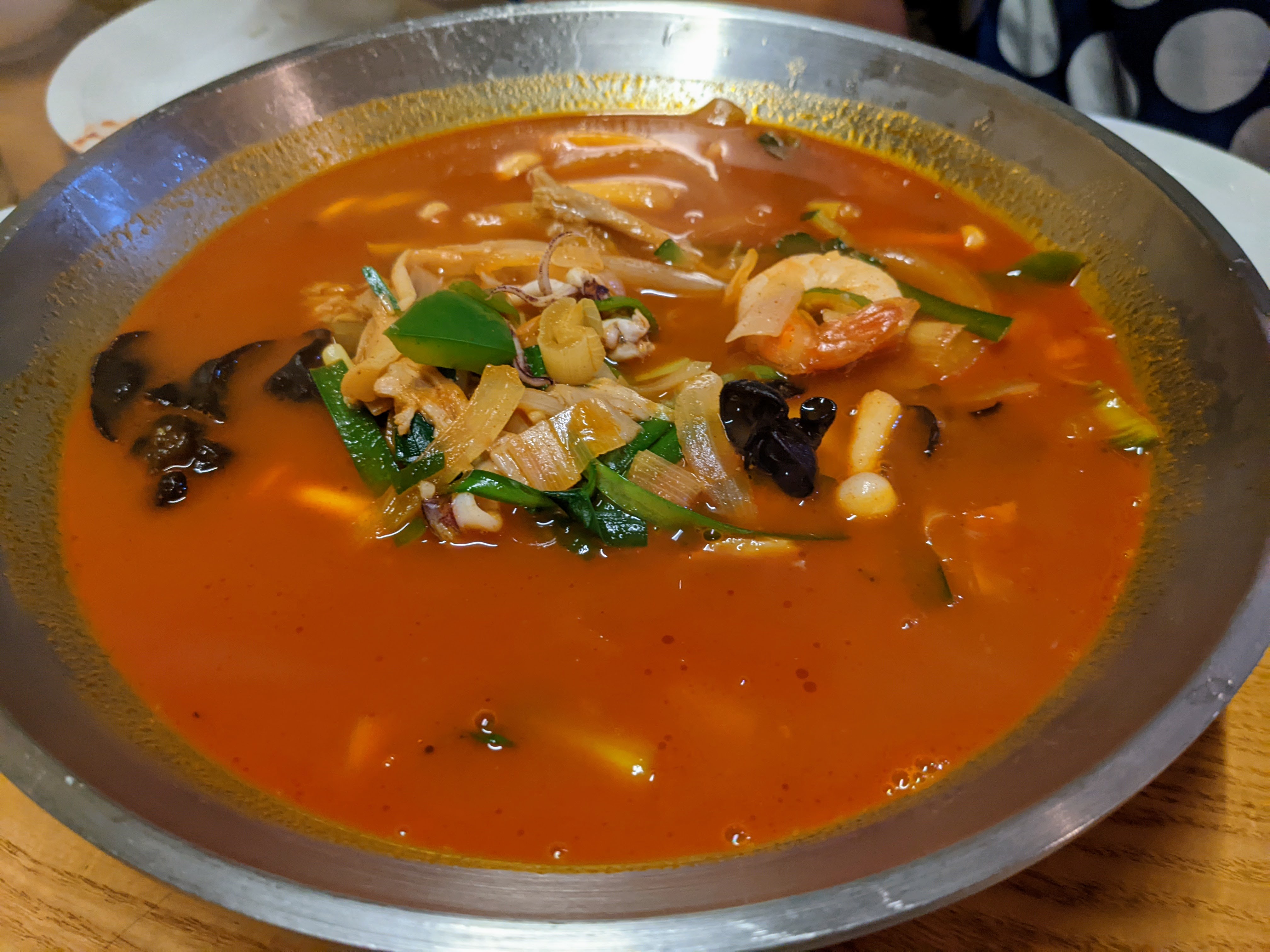The eponymous star of the show here is jjajangmyeon (짜장면), the Korean take on northern Chinese staple zhájiàngmiàn (炸酱面). While the two look outwardly similar, they’re quite different: zhájiàngmiàn is salty, umami-laden and typically contains little other than minced meat, hence the epithet “Chinese spaghetti bolognese”, while jjajangmyeon dials down the saltiness and packs the sauce with soft, sweet caramelized onions instead. Another famous Korean-Chinese dish is jjamppong (짬뽕), the spicy Korean version of champon, a famous Nagasaki seafood & pork ramen soup, which in turn was imported to Japan from Fujian. O.Bba’s take was generously laden with mussels, shrimp, squid, and despite the blood red color wasn’t all that spicy. As always, the kids devoured a plate of dumplings, this time deep-fried (군만두 gunmandu), served with a very tasty dipping sauce of soy, chilli and sesame. These, too, are of Chinese origin, and even the name comes from the Chinese mántou (馒头), although that means a meatless steamed bun these days and these would be called zhàjiǎo (炸饺).