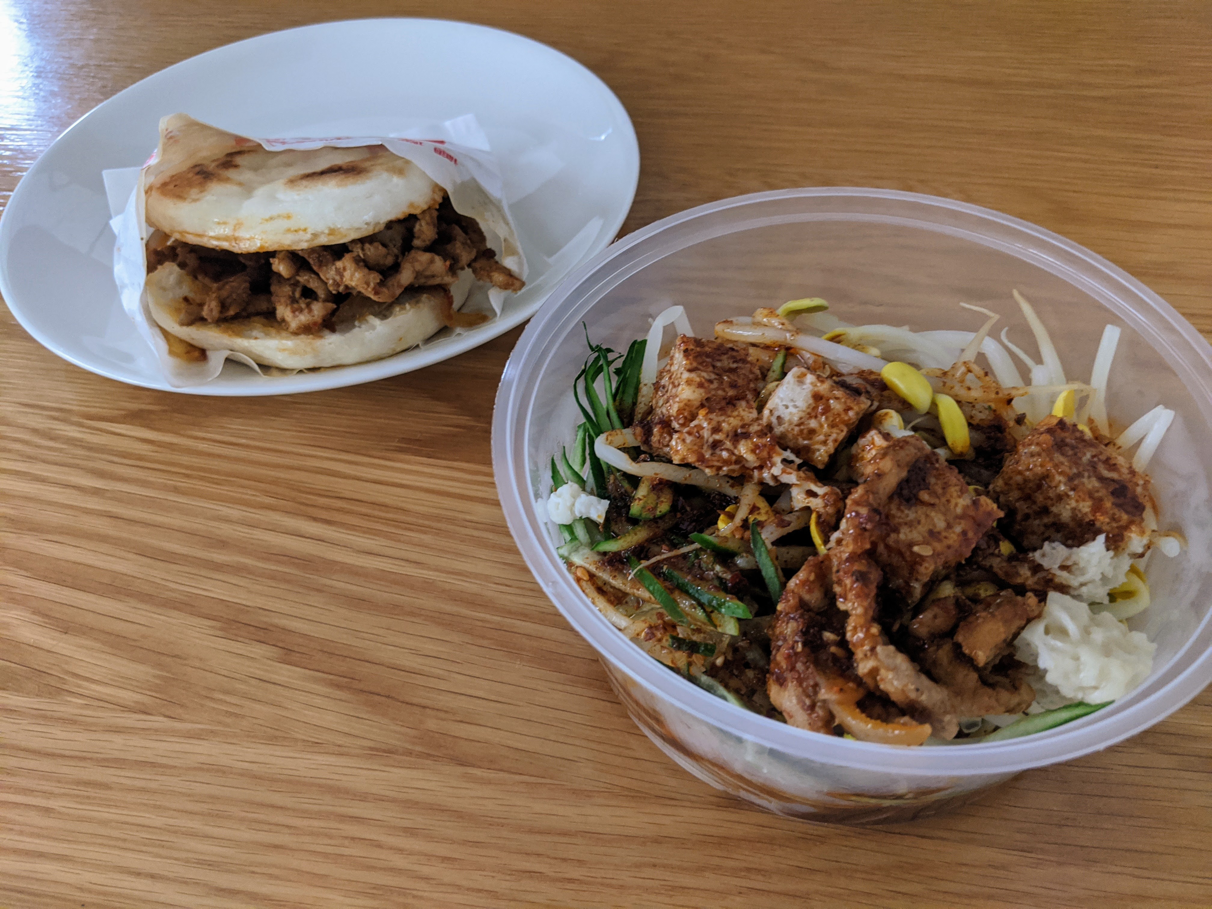 In Singapore, Shaanxi restaurants are not exactly mainstream, but you can find about half a dozen if you look. I started off with fast food outlet Qin Ji Rougamo (秦记肉夹馍), lurking in the excitingly named Alexandra Retail Complex near Labrador Park MRT, where I sampled the classic Xi’an Triangle: a Chinese-style pulled pork burger (肉夹馍 ròujiāmó/ròugāmó), a bowl of cold liángpí (涼皮) noodles, and a can of Ice Peak (冰峰 Bīngfēng). The rougamo here are great, the mo flatbread a delicate spiral crispy at the edges but soft enough to eat, and the rich pulled pork doused in sauce melts in your mouth — and all over your pants if you don’t eat carefully enough. The liangpi noodles themselves were fine and toppings were positively fancy, with a spray of cucumber, beansprouts, little crunchy dough balls and spongy kǎofū gluten, but you can only get the “default” kind with chilli oil (I prefer the sesame variant) and it comes premixed and quite soggy (I prefer them drier, with DIY toppings). And the Ice Peak, well, it’s orange Fanta, no more, no less. At $11.90 nett, it’s a pretty good lunch, but I’ll get soy milk and try another side dish next time.
