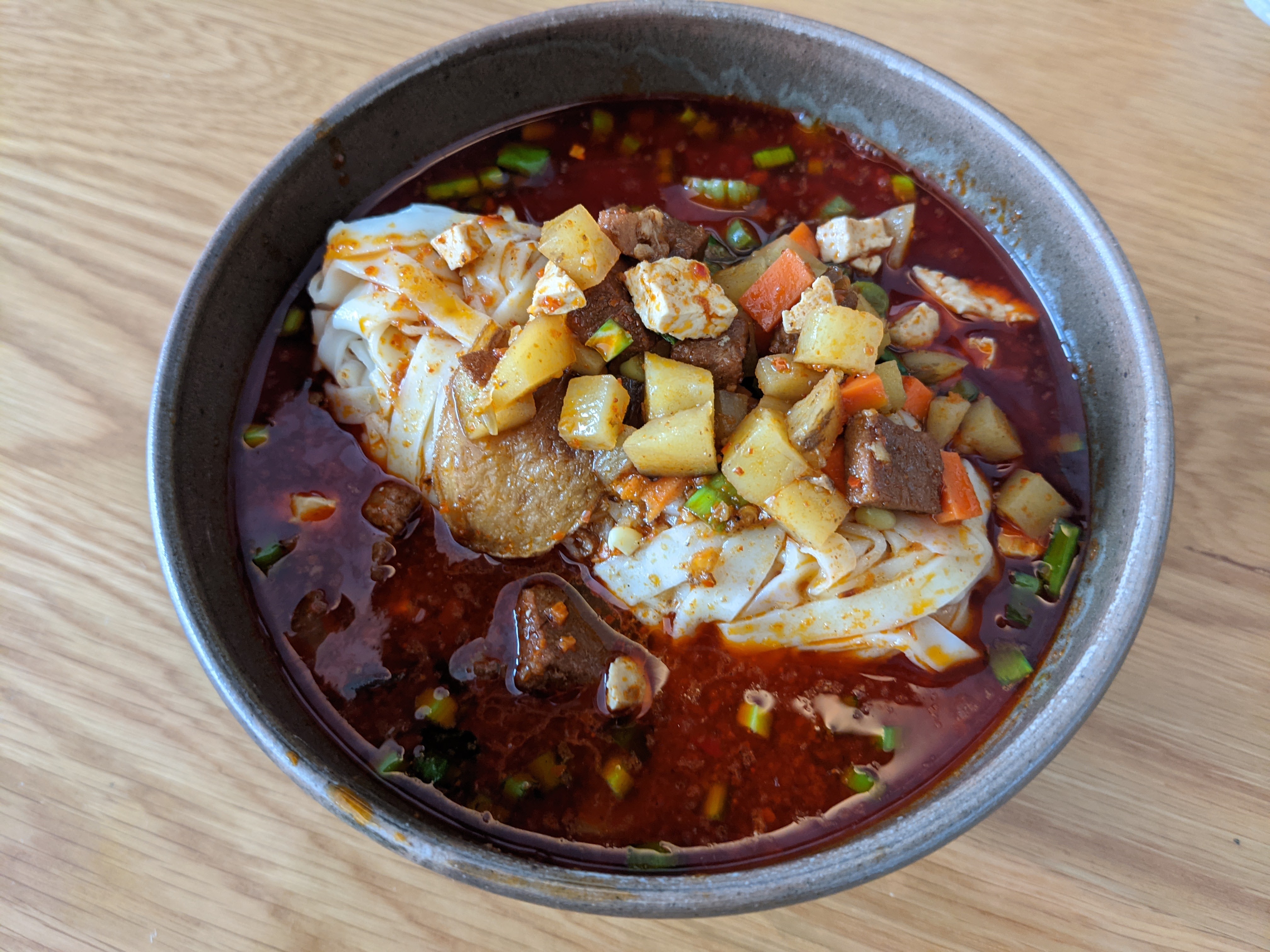 There’s a fair selection of other Shaanxi favorites here too, but the lumpy, dry rougamo here can’t hold a candle to Qin Ji and the liangpi is nothing special either. One dish did catch my eye, namely Qishan noodles (岐山臊子面 Qíshān sàozimiàn), where the middle word is omitted from the English name because it’s virtually untranslatable. If you look it up in a dictionary, 臊 sāo means “urine-scented”, leading to occasional hilarity, but pronounced with a falling tone (sào) it means “embarrass”. A convoluted legend says the name actually comes from near-homonym 嫂 sǎo meaning “sister-in-law”, and the character was swapped over time. At Biang Biang the menu even spells it wrong as 哨子面 shàozimiàn, which would be “whistle noodles”. Confused yet? After all this, the actual meaning of 臊子 is a tad anti-climactic: it’s… minced meat sauce. Canonical saozi has cubes made from red carrots, green garlic shoots, black wood ear fungus, yellow eggs and white beancurd, all topped with a soup that’s supposed to be hot & sour, but not pungent (urine or otherwise) and no mala either. Biang Biang’s version substitutes potato for eggs, but otherwise ticks all the boxes.