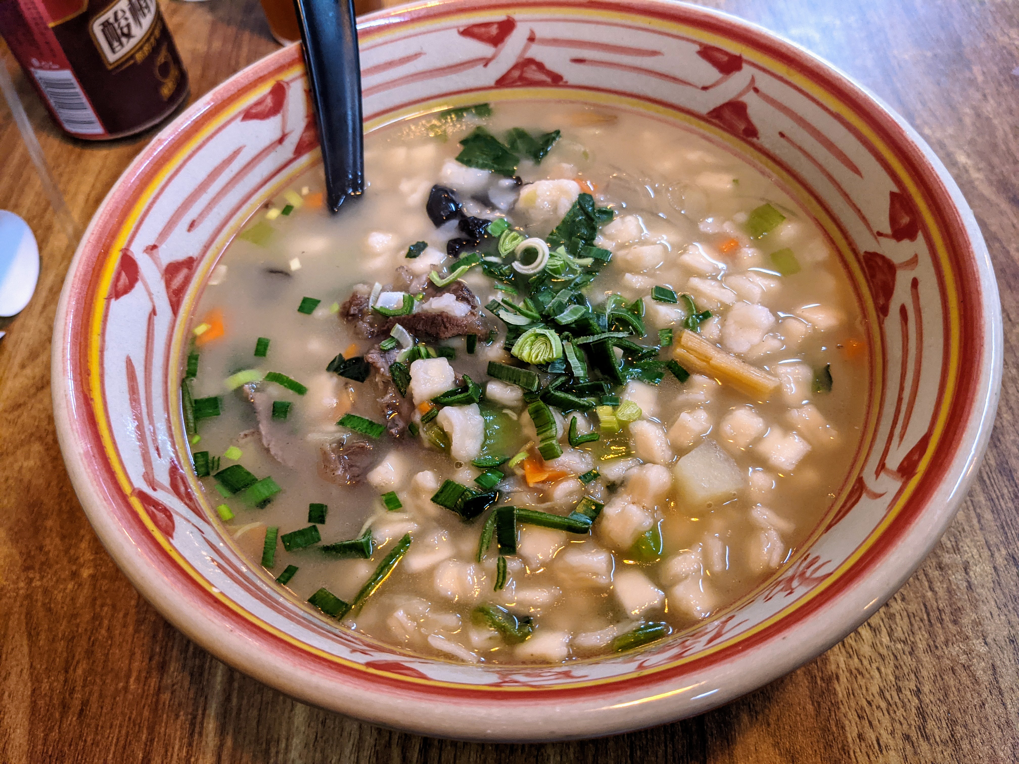 Third up, I paid a visit to Shaanxi Noodles (寻秦记 Xúnqínjì, “Seeking Qin Brand”) in hipster enclave Tiong Bahru for another shot at lamb paomo (羊肉泡馍 yángròu pàomó). This rather unusual soup consists of a thick lamb broth with slivers of meat, a few token veggies, and the same mo flatbread as used for rougamo, shredded by hand and sprinkled into the soup by the diner themselves. The lady taking my order quizzically asked me if I knew how to eat paomo, but apparently didn’t believe my claim that I did, since my mo had been neatly presliced into little cubes. Sigh. On the upside, the soup was rather tasty if salty, and came with the canonical sides of chilli paste and pickled garlic, which added a nice kick.
